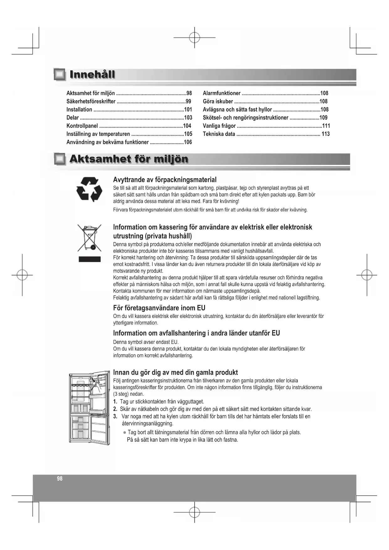 - återvinningsanläggning. ● Tag bort allt tätningsmaterial från dörren och lämna alla hyllor och lådor på plats. På så sätt kan barn inte krypa in lika lätt och fastna. Aktsamhet för miljön Innehåll Aktsamhet för miljön p. 98