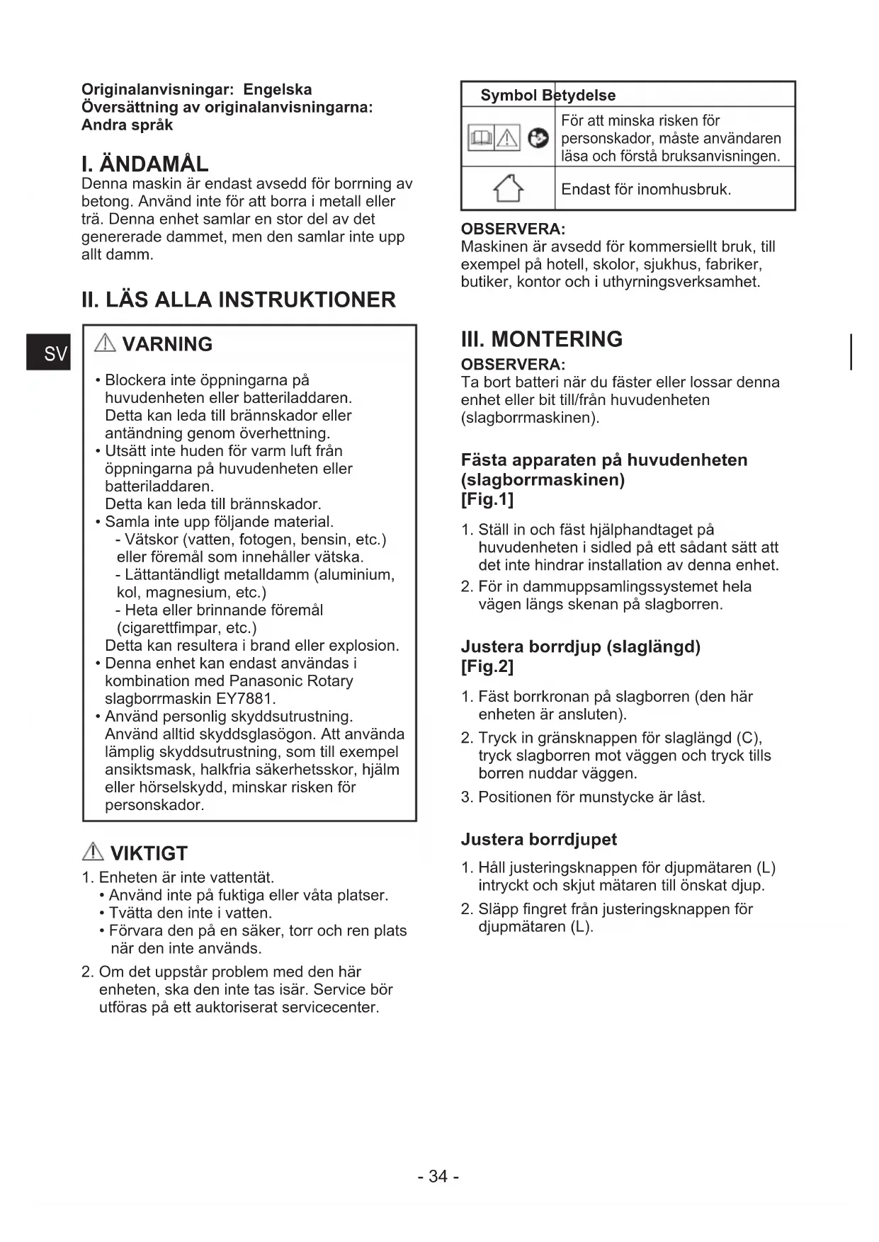 - Denna enhet kan endast användas i kombination med Panasonic Rotary slagborrmaskin EY7881.