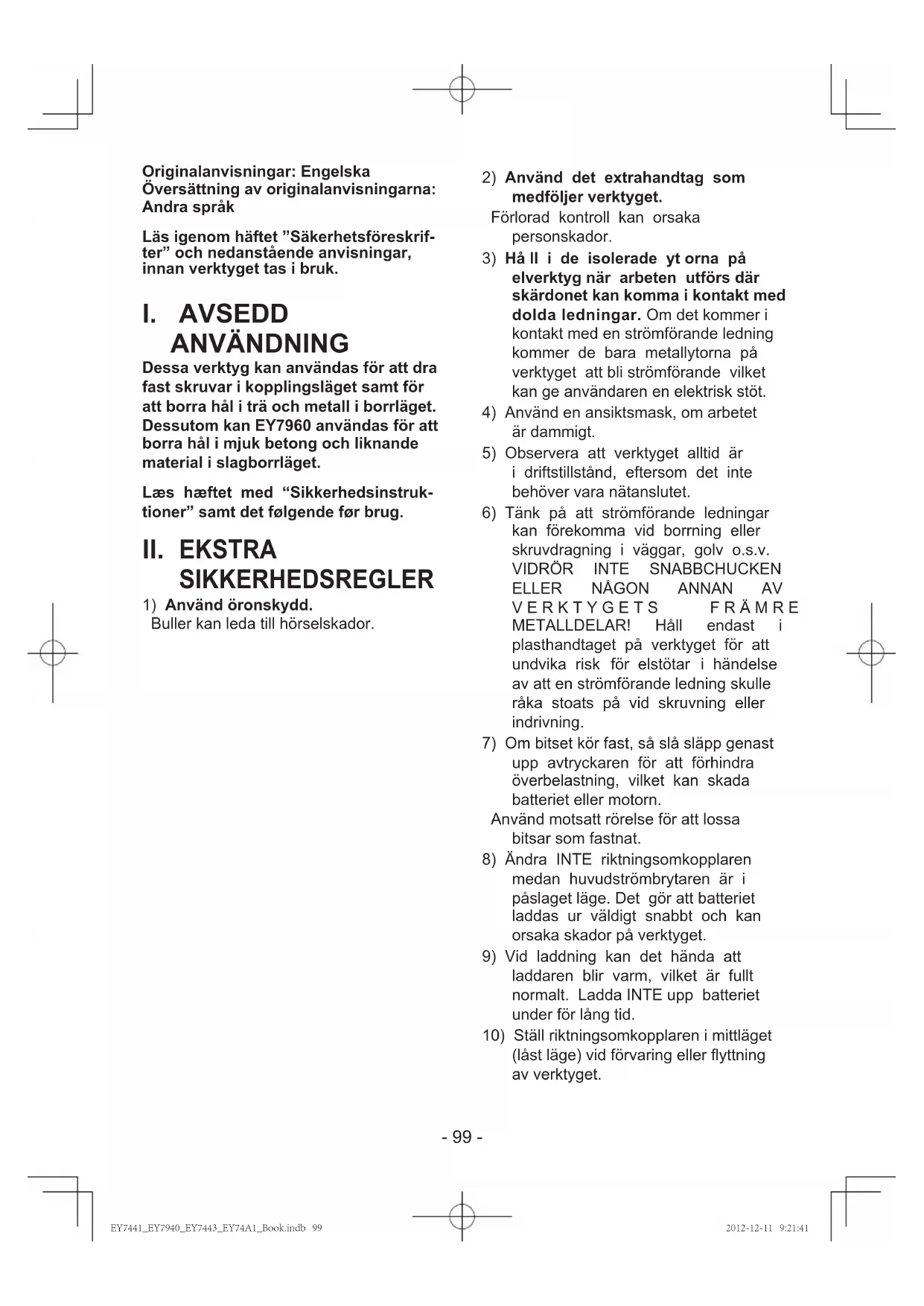 (låst läge) vid förvaring eller flyttning av verktyget. Originalanvisningar: Engelska Översättning av originalanvisningarna: Andra språk Läs igenom häftet ”Säkerhetsföreskrif- ter” och nedanstående anvisningar, innan verktyget tas i bruk. EY7441_EY7940_EY7443_EY74A1_Book.indb 99 2012-12-11 9:21:41- 100 -