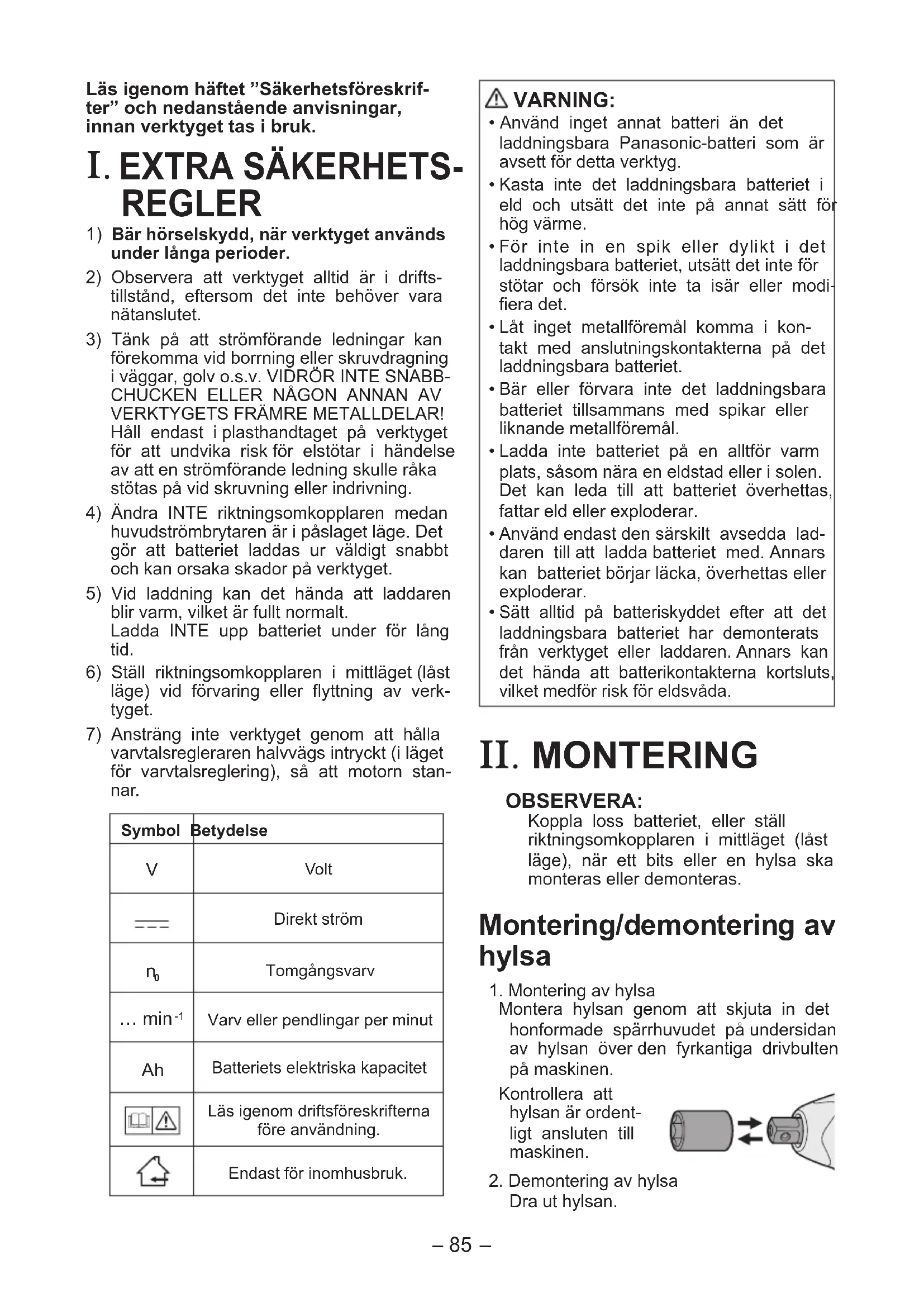 Tomgångsvarv… min Varv eller pendlingar per minut Batteriets elektriska kapacitetLäs igenom driftsföreskrifterna före användning.Endast för inomhusbruk. VARNING: