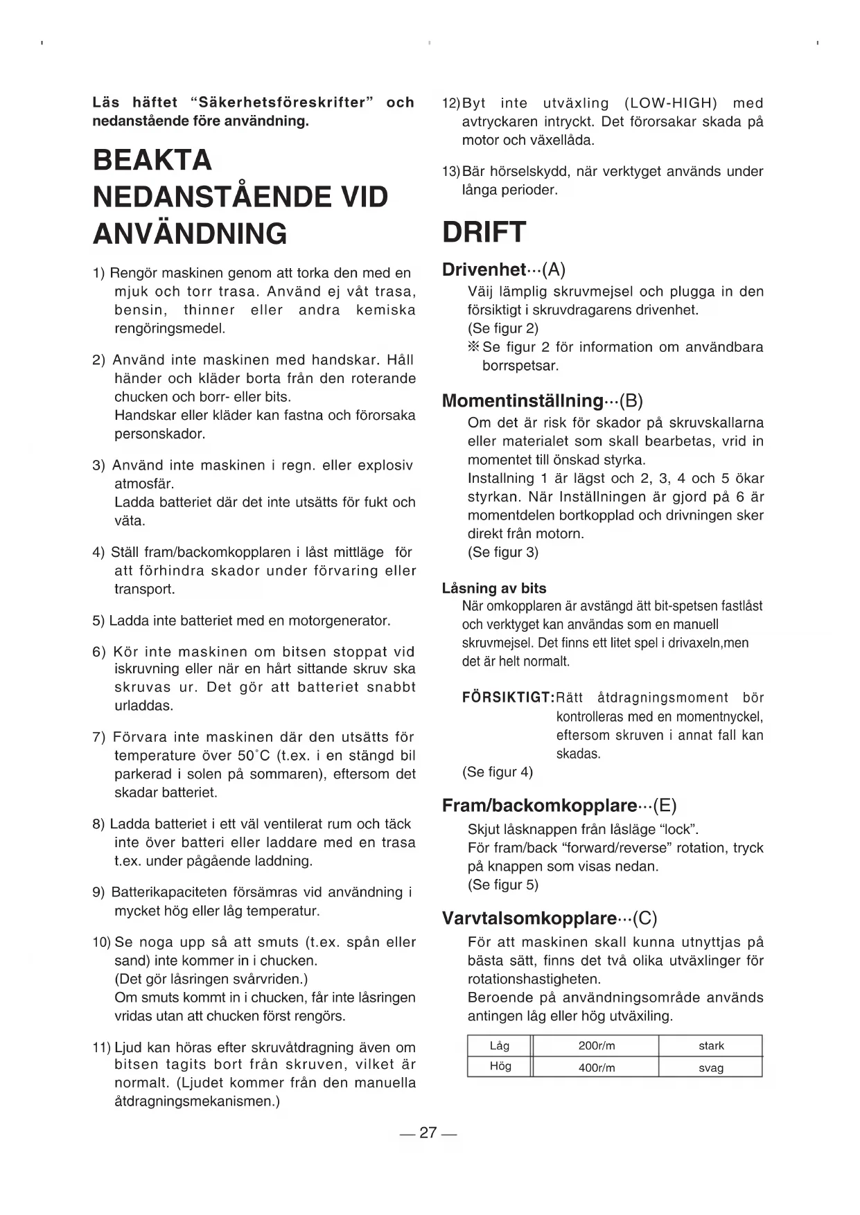 - Koppla bort laddaren då den inte används. P27-29(6220SW) 05.05.02 10:21 ページ2829 TEKNISKA DATA Maskin (EY6220/ EY503) Motor 2,4 V likspänning Tomgängs varvtal Låg: 200 r/m Hög: 400 r/m Maximal diameter för borrning i metall 2 mm (5/64″) Maximalt vridmoment Låg: 2,9 Nm Hög: 1,5 Nm Totallängd 239 mm Vikt 0,4 kg Batteri (EY9021/EY903) Typ Ni-Cd Spänning 2,4 V DC (1,2 × 2 ceiler) Laddare (EY0020/RE503) Inspänning 230 V AC 50Hz Utspänning 2,4 V DC Vikt 0,7 kg Tänk på att Ni-Cd-batterier är miljofarliga. Gamla batterier skall lämnas in för återvinning enligt lag. Ni-Cd OBSERVERA: Angående vilka batterier som är tillämpliga för batteriladdaren hänvisas till etiketten på laddaren eller senaste produktkatalog. P27-29(6220SW) 05.05.02 10:21 ページ2930 Les heftet “Sikkerhetsinstruksjoner” og det følgende før du tar verktøyet i bruk. FORSIKTIGHETSREGLER
