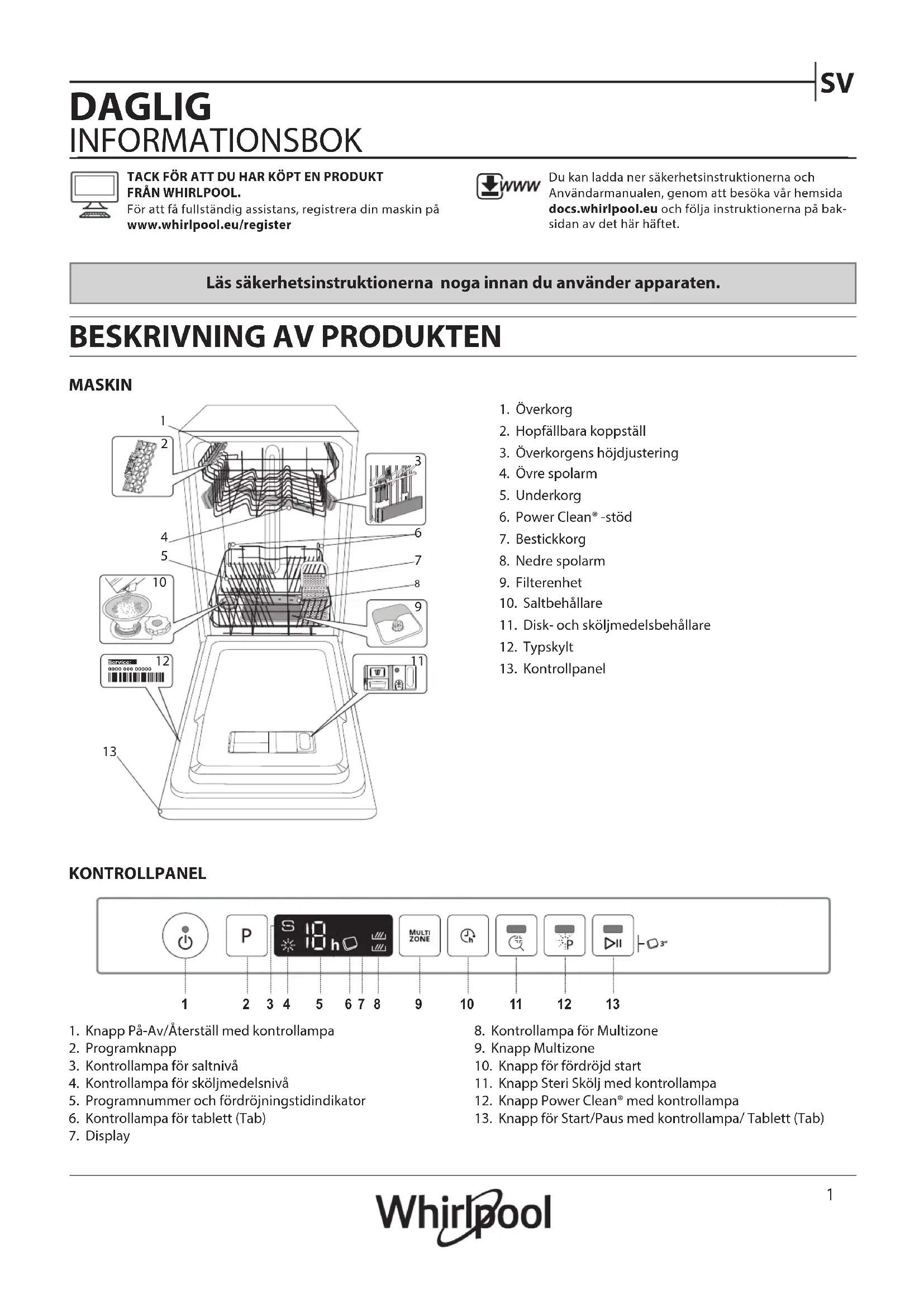 Du kan ladda ner säkerhetsinstruktionerna och Användarmanualen, genom att besöka vår hemsida docs.whirlpool.eu och följa instruktionerna på bak-sidan av det här häftet. MASKIN1. Överkorg2. Hopfällbara koppställ3. Överkorgens höjdjustering4. Övre spolarm5. Underkorg6. Power Clean® -stöd7. Bestickkorg8. Nedre spolarm9. Filterenhet10. Saltbehållare11. Disk- och sköljmedelsbehållare12. Typskylt13. Kontrollpanel1. Knapp På-Av/Återställ med kontrollampa2. Programknapp3. Kontrollampa för saltnivå4. Kontrollampa för sköljmedelsnivå5. Programnummer och fördröjningstidindikator6. Kontrollampa för tablett (Tab) 7. DisplayKONTROLLPANEL