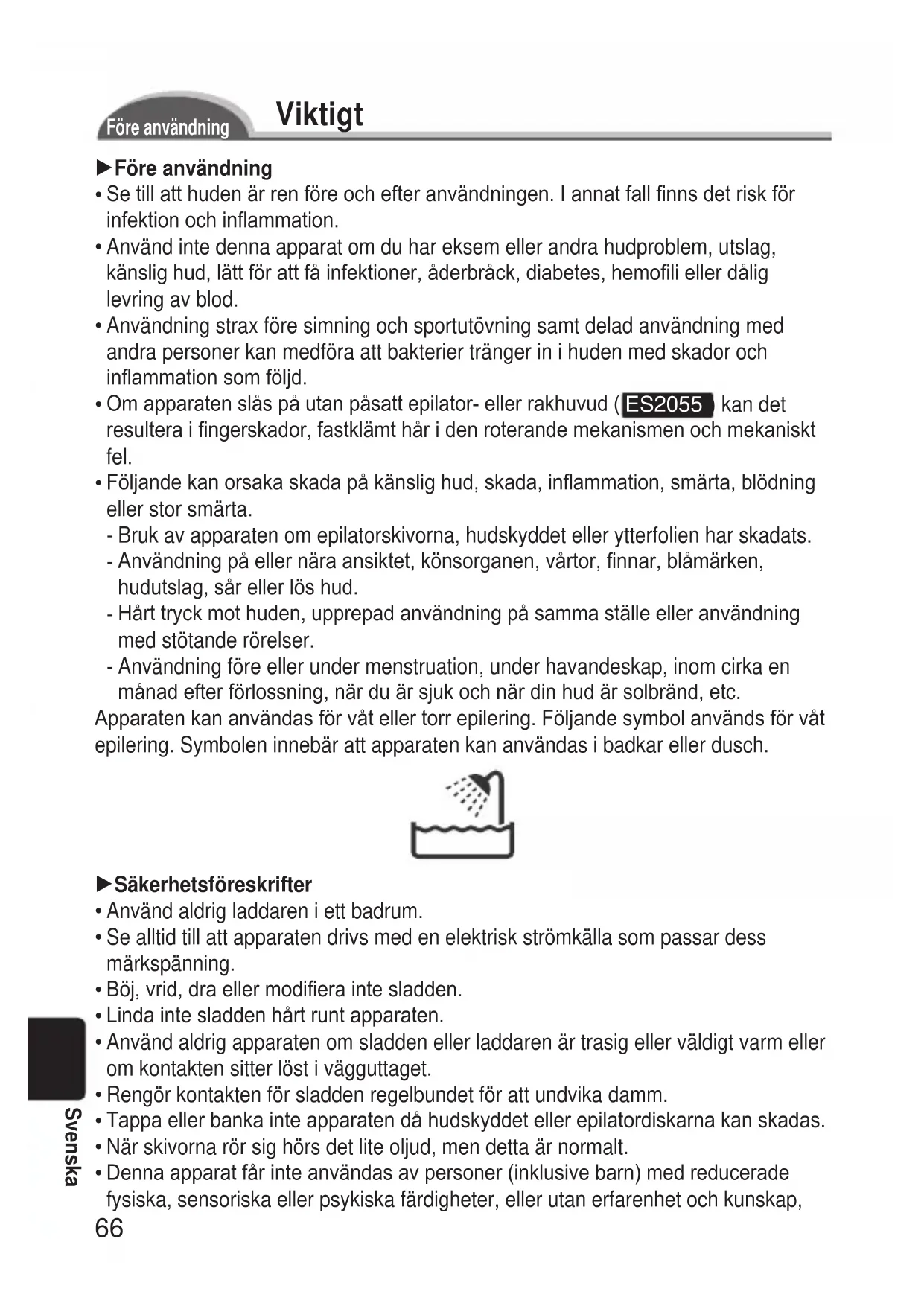 Utløserknapp for ramme Tilbehør: Lader (RE7- 44), rengjøringsbørste og pose (Vennligst ikke bruk annet tilbehør enn det medfølgende tilbehøret.)66 Svenska Viktigt Före användning 1Före användning Se till att huden är ren före och efter användningen. I annat fall nns det risk för infektion och inammation. Använd inte denna apparat om du har eksem eller andra hudproblem, utslag, känslig hud, lätt för att få infektioner, åderbråck, diabetes, hemoli eller dålig levring av blod. Användning strax före simning och sportutövning samt delad användning med andra personer kan medföra att bakterier tränger in i huden med skador och inammation som följd. Om apparaten slås på utan påsatt epilator- eller rakhuvud ( ES2055 ) kan det resultera i ngerskador, fastklämt hår i den roterande mekanismen och mekaniskt fel. Följande kan orsaka skada på känslig hud, skada, inammation, smärta, blödning eller stor smärta. Bruk av apparaten om epilatorskivorna, hudskyddet eller ytterfolien har skadats. Användning på eller nära ansiktet, könsorganen, vårtor, nnar, blåmärken, hudutslag, sår eller lös hud. Hårt tryck mot huden, upprepad användning på samma ställe eller användning med stötande rörelser. Användning före eller under menstruation, under havandeskap, inom cirka en månad efter förlossning, när du är sjuk och när din hud är solbränd, etc. Apparaten kan användas för våt eller torr epilering. Följande symbol används för våt epilering. Symbolen innebär att apparaten kan användas i badkar eller dusch. 1Säkerhetsföreskrifter Använd aldrig laddaren i ett badrum. Se alltid till att apparaten drivs med en elektrisk strömkälla som passar dess märkspänning. Böj, vrid, dra eller modiera inte sladden. Linda inte sladden hårt runt apparaten. Använd aldrig apparaten om sladden eller laddaren är trasig eller väldigt varm eller om kontakten sitter löst i vägguttaget. Rengör kontakten för sladden regelbundet för att undvika damm. Tappa eller banka inte apparaten då hudskyddet eller epilatordiskarna kan skadas. När skivorna rör sig hörs det lite oljud, men detta är normalt. Denna apparat får inte användas av personer (inklusive barn) med reducerade fysiska, sensoriska eller psykiska färdigheter, eller utan erfarenhet och kunskap,