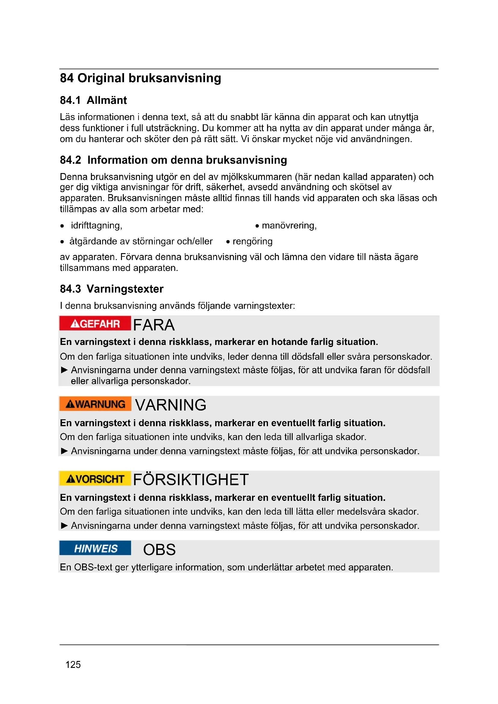 FÖRSIKTIGHET En varningstext i denna riskklass, markerar en eventuellt farlig situation. Om den farliga situationen inte undviks, kan den leda till lätta eller medelsvåra skador. ► Anvisningarna under denna varningstext måste följas, för att undvika personskador. OBS En OBS-text ger ytterligare information, som underlättar arbetet med apparaten.126