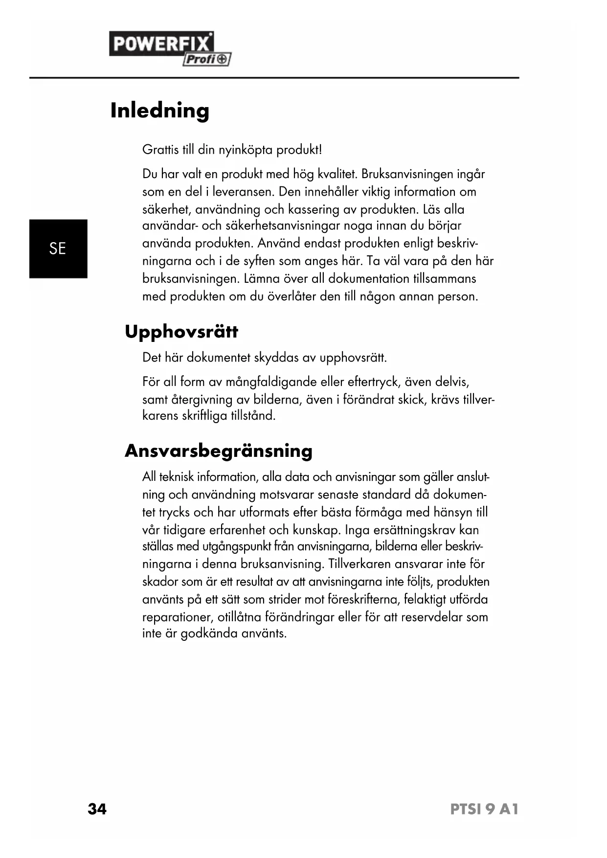 BRUKSANVISNING PTSI 9 A1 POWERFIX