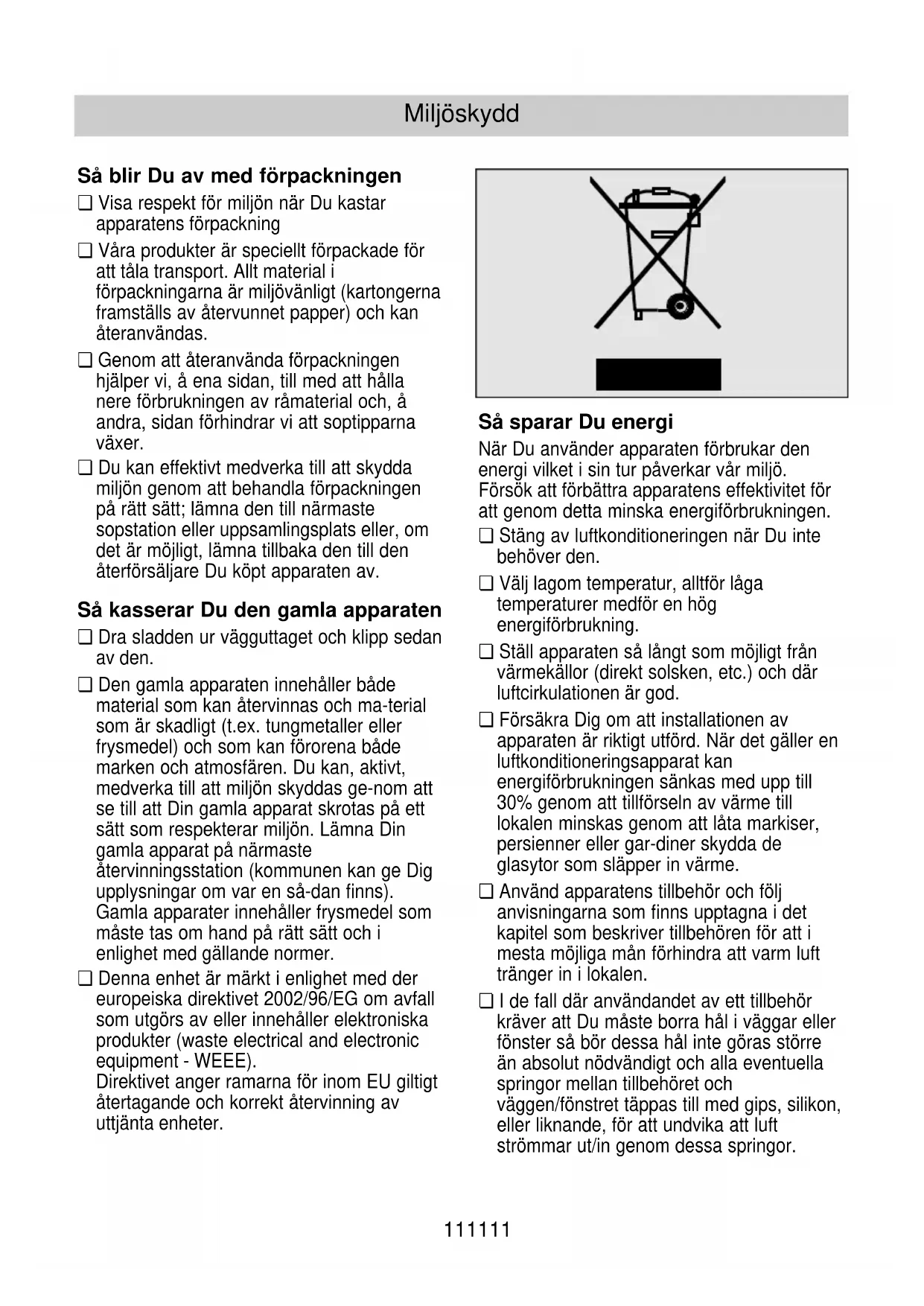 Miljöskydd Så blir Du av med förpackningen ❏ Visa respekt för miljön när Du kastar apparatens förpackning ❏ Våra produkter är speciellt förpackade för att tåla transport. Allt material i förpackningarna är miljövänligt (kartongerna framställs av återvunnet papper) och kan återanvändas. ❏ Genom att återanvända förpackningen hjälper vi, å ena sidan, till med att hålla nere förbrukningen av råmaterial och, å andra, sidan förhindrar vi att soptipparna växer. ❏ Du kan effektivt medverka till att skydda miljön genom att behandla förpackningen på rätt sätt; lämna den till närmaste sopstation eller uppsamlingsplats eller, om det är möjligt, lämna tillbaka den till den återförsäljare Du köpt apparaten av. Så kasserar Du den gamla apparaten ❏ Dra sladden ur vägguttaget och klipp sedan av den. ❏ Den gamla apparaten innehåller både material som kan återvinnas och ma-terial som är skadligt (t.ex. tungmetaller eller frysmedel) och som kan förorena både marken och atmosfären. Du kan, aktivt, medverka till att miljön skyddas ge-nom att se till att Din gamla apparat skrotas på ett sätt som respekterar miljön. Lämna Din gamla apparat på närmaste återvinningsstation (kommunen kan ge Dig upplysningar om var en så-dan finns). Gamla apparater innehåller frysmedel som måste tas om hand på rätt sätt och i enlighet med gällande normer. ❏ Denna enhet är märkt i enlighet med der europeiska direktivet 2002/96/EG om avfall som utgörs av eller innehåller elektroniska produkter (waste electrical and electronic equipment - WEEE). Direktivet anger ramarna för inom EU giltigt återtagande och korrekt återvinning av uttjänta enheter. Så sparar Du energi När Du använder apparaten förbrukar den energi vilket i sin tur påverkar vår miljö. Försök att förbättra apparatens effektivitet för att genom detta minska energiförbrukningen. ❏ Stäng av luftkonditioneringen när Du inte behöver den. ❏ Välj lagom temperatur, alltför låga temperaturer medför en hög energiförbrukning. ❏ Ställ apparaten så långt som möjligt från värmekällor (direkt solsken, etc.) och där luftcirkulationen är god. ❏ Försäkra Dig om att installationen av apparaten är riktigt utförd. När det gäller en luftkonditioneringsapparat kan energiförbrukningen sänkas med upp till 30% genom att tillförseln av värme till lokalen minskas genom att låta markiser, persienner eller gar-diner skydda de glasytor som släpper in värme. ❏ Använd apparatens tillbehör och följ anvisningarna som finns upptagna i det kapitel som beskriver tillbehören för att i mesta möjliga mån förhindra att varm luft tränger in i lokalen. ❏ I de fall där användandet av ett tillbehör kräver att Du måste borra hål i väggar eller fönster så bör dessa hål inte göras större än absolut nödvändigt och alla eventuella springor mellan tillbehöret och väggen/fönstret täppas till med gips, silikon, eller liknande, för att undvika att luft strömmar ut/in genom dessa springor.Viktig information