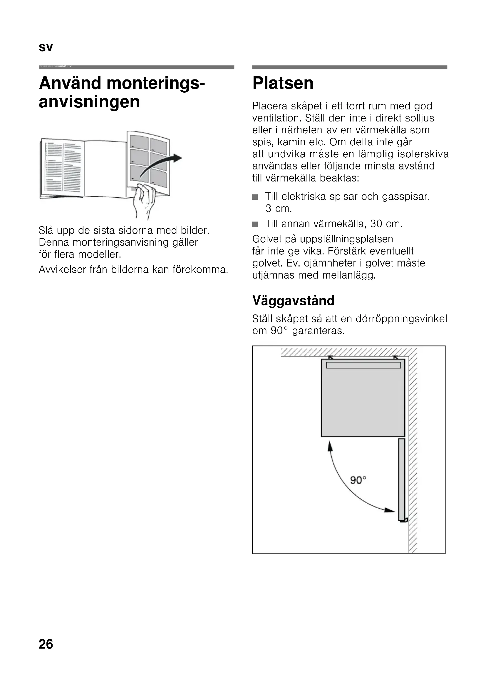 svIn nehål lsförte ckning svMonterin gsanvis ning Fristående skåp Använd monterings- anvisningen Slå upp de sista sidorna med bilder. Denna monteringsanvisning gäller för flera modeller. Avvikelser från bilderna kan förekomma. Platsen Placera skåpet i ett torrt rum med god ventilation. Ställ den inte i direkt solljus eller i närheten av en värmekälla som spis, kamin etc. Om detta inte går att undvika måste en lämplig isolerskiva användas eller följande minsta avstånd till värmekälla beaktas: ■ Till elektriska spisar och gasspisar, 3cm. ■ Till annan värmekälla, 30 cm. Golvet på uppställningsplatsen får inte ge vika. Förstärk eventuellt golvet. Ev. ojämnheter i golvet måste utjämnas med mellanlägg. Väggavstånd Ställ skåpet så att en dörröppningsvinkel om 90° garanteras.sv