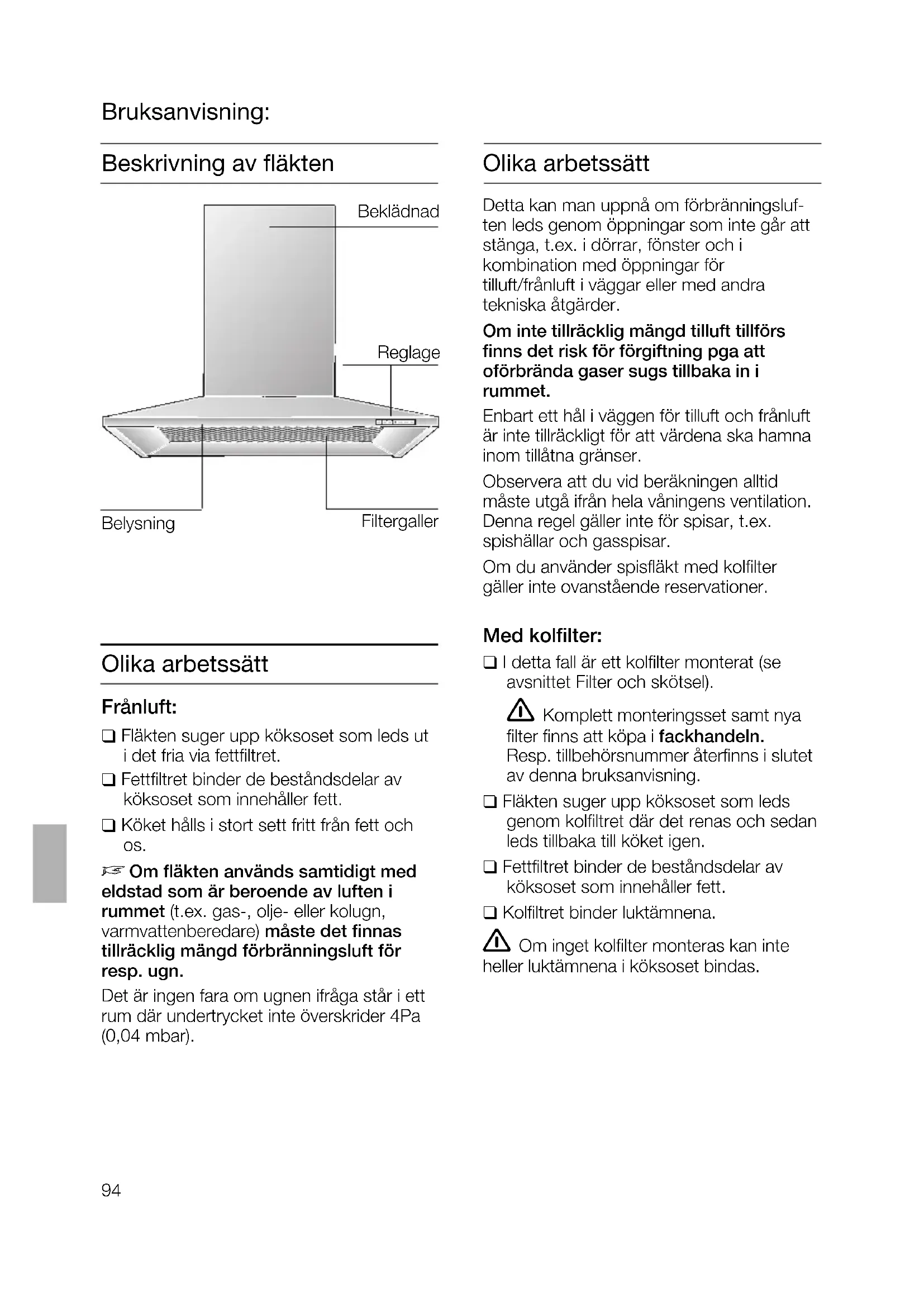 Om fläkten används samtidigt med eldstad som är beroende av luften i rummet (t.ex. gas-, olje- eller kolugn, varmvattenberedare) måste det finnas tillräcklig mängd förbränningsluft för resp. ugn. Det är ingen fara om ugnen ifråga står i ett rum där undertrycket inte överskrider 4Pa (0,04 mbar). Detta kan man uppnå om förbränningsluf- ten leds genom öppningar som inte går att stänga, t.ex. i dörrar, fönster och i kombination med öppningar för tilluft/frånluft i väggar eller med andra tekniska åtgärder. Om inte tillräcklig mängd tilluft tillförs finns det risk för förgiftning pga att oförbrända gaser sugs tillbaka in i rummet. Enbart ett hål i väggen för tilluft och frånluft är inte tillräckligt för att värdena ska hamna inom tillåtna gränser. Observera att du vid beräkningen alltid måste utgå ifrån hela våningens ventilation. Denna regel gäller inte för spisar, t.ex. spishällar och gasspisar. Om du använder spisfläkt med kolfilter gäller inte ovanstående reservationer. Om frånluften leds ut genom yttervägg bör teleskopisk anslutningslåda mot mur användas. Ej tillåtet i Sverige. Frånluft