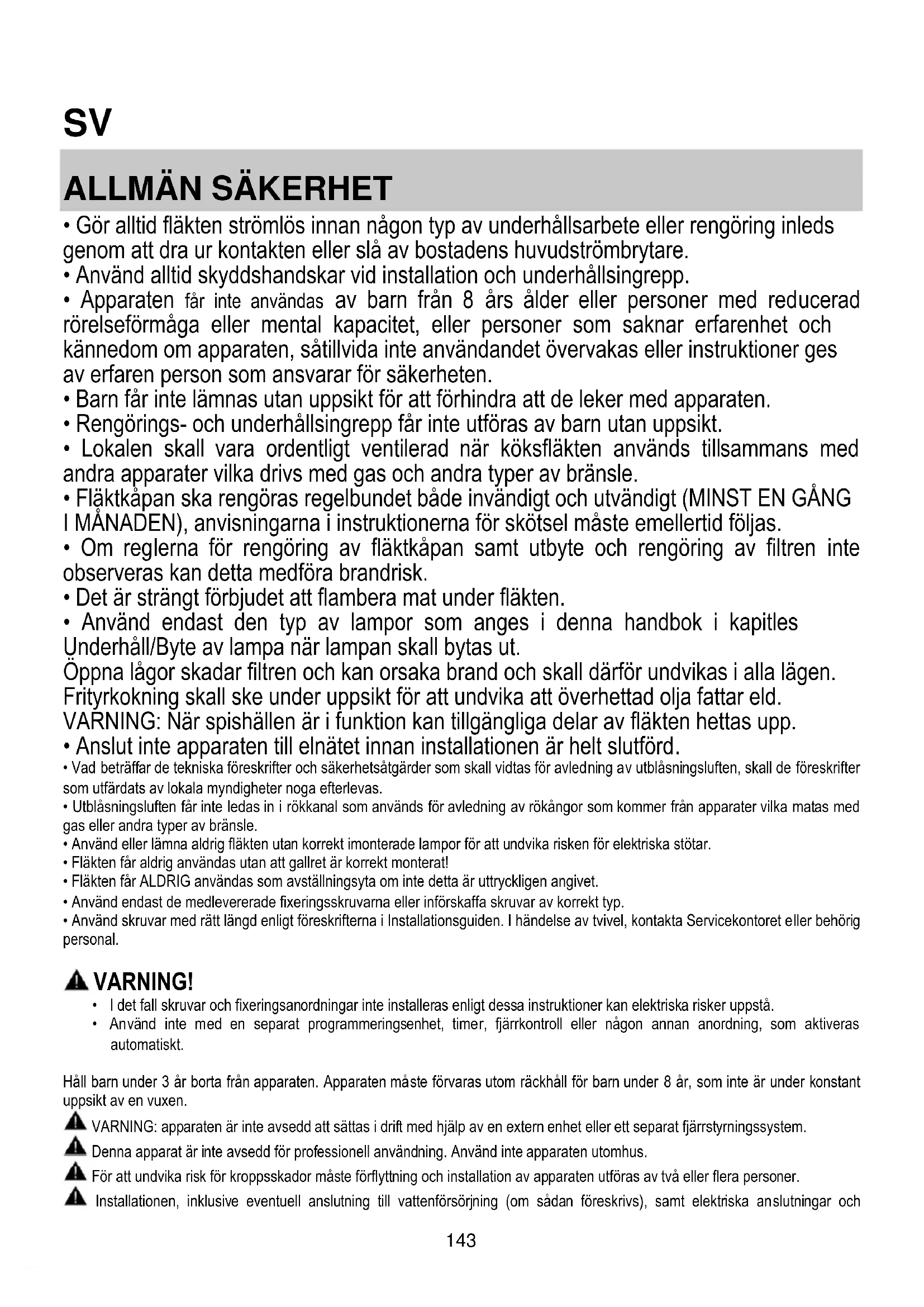 - Lokalen skall vara ordentligt ventilerad när köksfläkten används tillsammans med andra apparater vilka drivs med gas och andra typer av bränsle.