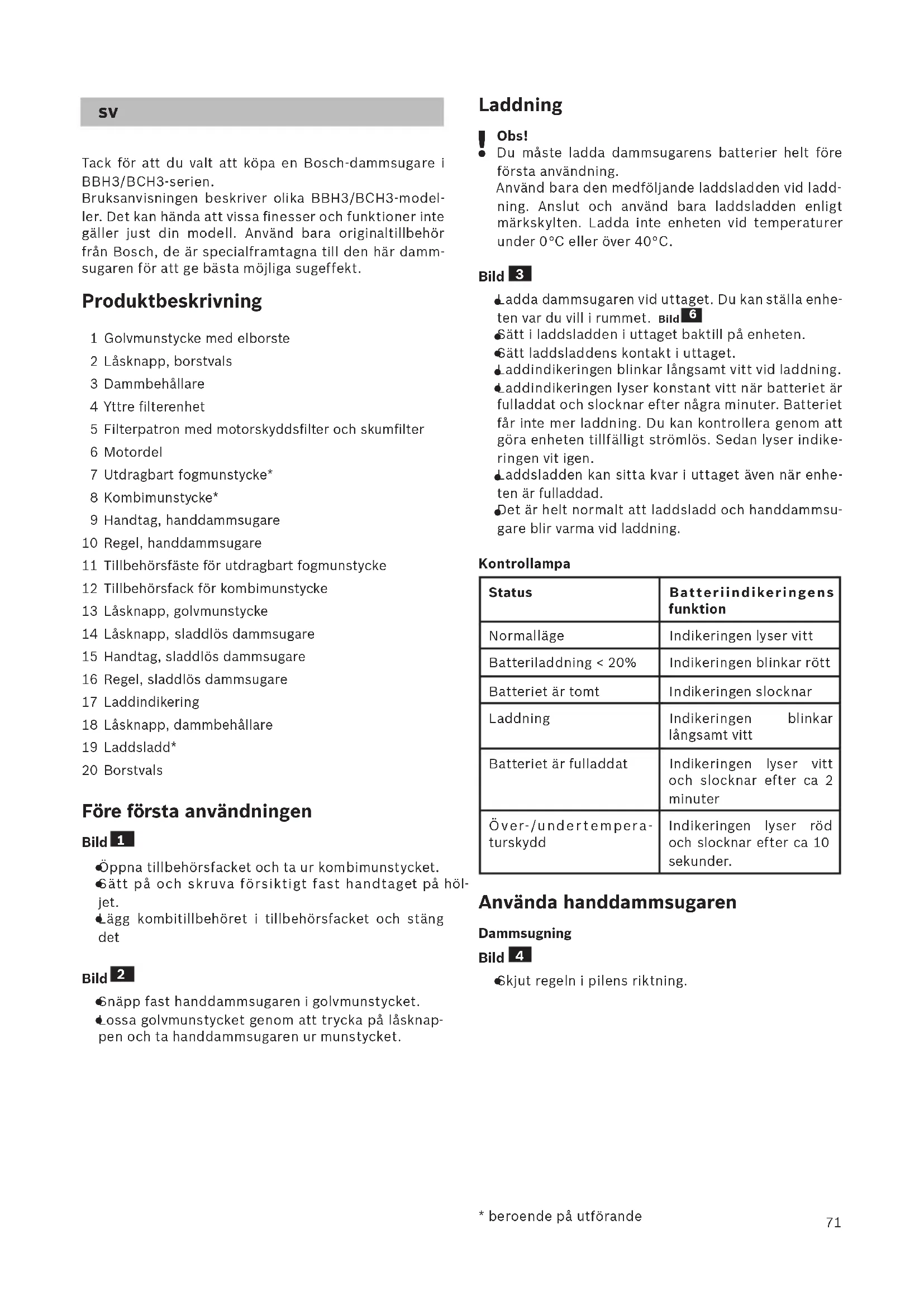 Tack för att du valt att köpa en Bosch-dammsugare i BBH3/BCH3-serien. Bruksanvisningen beskriver olika BBH3/BCH3-model- ler. Det kan hända att vissa finesser och funktioner inte gäller just din modell. Använd bara originaltillbehör från Bosch, de är specialframtagna till den här damm- sugaren för att ge bästa möjliga sugeffekt. Produktbeskrivning 1 Golvmunstycke med elborste 2 Låsknapp, borstvals 3 Dammbehållare 4 Yttre filterenhet 5 Filterpatron med motorskyddsfilter och skumfilter 6 Motordel 7 Utdragbart fogmunstycke* 8 Kombimunstycke* 9 Handtag, handdammsugare 10 Regel, handdammsugare 11 Tillbehörsfäste för utdragbart fogmunstycke 12 Tillbehörsfack för kombimunstycke 13 Låsknapp, golvmunstycke 14 Låsknapp, sladdlös dammsugare 15 Handtag, sladdlös dammsugare 16 Regel, sladdlös dammsugare 17 Laddindikering 18 Låsknapp, dammbehållare 19 Laddsladd* 20 Borstvals Före första användningen Bild