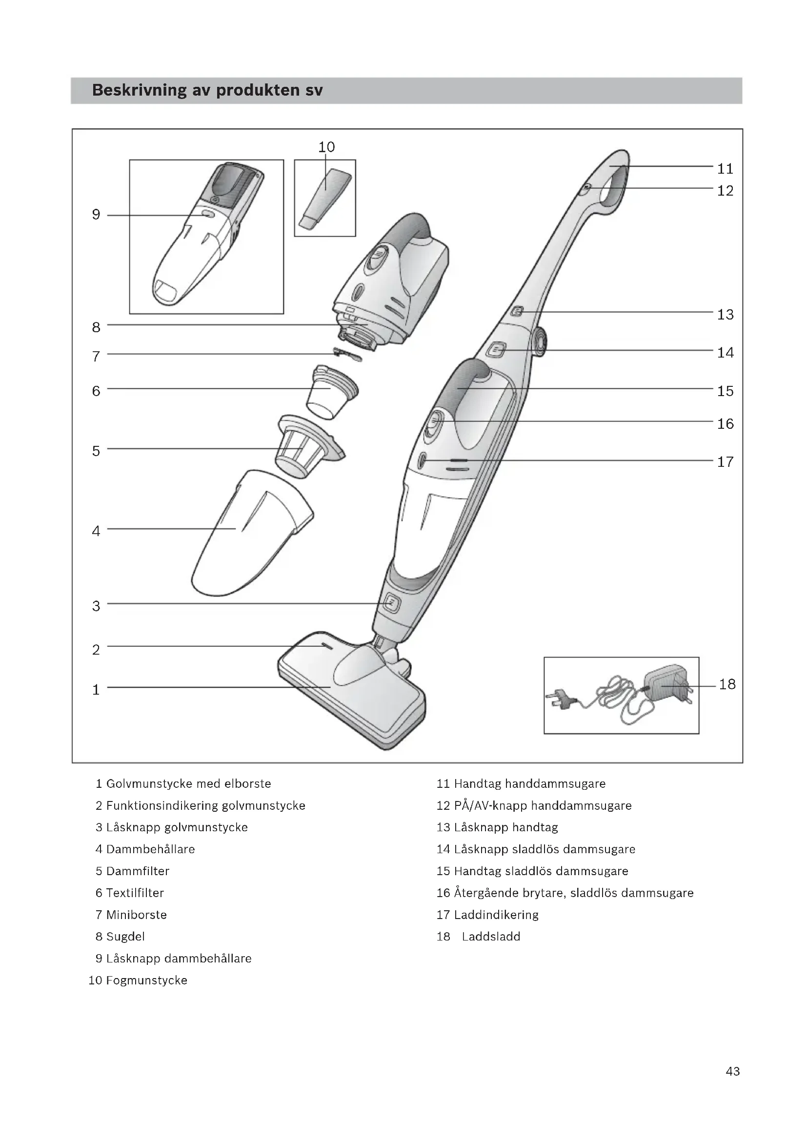 1 Golvmunstycke med elborste 2 Funktionsindikering golvmunstycke 3 Låsknapp golvmunstycke 4 Dammbehållare 5 Dammfilter 6 Textilfilter 7 Miniborste 8 Sugdel 9 Låsknapp dammbehållare 10 Fogmunstycke 11 Handtag handdammsugare 12 PÅ/AV-knapp handdammsugare 13 Låsknapp handtag 14 Låsknapp sladdlös dammsugare 15 Handtag sladdlös dammsugare 16 Återgående brytare, sladdlös dammsugare 17 Laddindikering 18 Laddstation 19 Bottendel laddstation 20 Laddsladd Laddsladd Beskrivning av produkten sv44