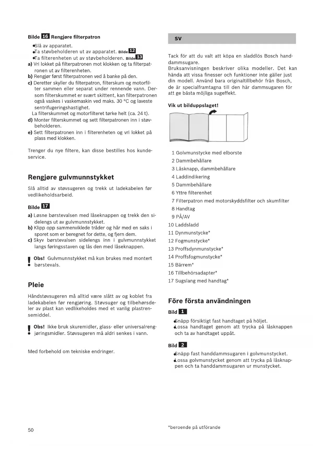 Tack för att du valt att köpa en sladdlös Bosch hand- dammsugare. Bruksanvisningen beskriver olika modeller. Det kan hända att vissa finesser och funktioner inte gäller just din modell. Använd bara originaltillbehör från Bosch, de är specialframtagna till den här dammsugaren för att ge bästa möjliga sugeffekt. Vik ut bilduppslaget! 1 Golvmunstycke med elborste 2 Dammbehållare 3 Låsknapp, dammbehållare 4 Laddindikering 5 Dammbehållare 6 Yttre filterenhet 7 Filterpatron med motorskyddsfilter och skumfilter 8 Handtag 9 PÅ/AV 10 Laddsladd 11 Dynmunstycke* 12 Fogmunstycke* 13 Proffsdynmunstycke* 14 Proffsfogmunstycke* 15 Bärrem* 16 Tillbehörsadapter* 17 Sugslang med handtag* Före första användningen Bild
