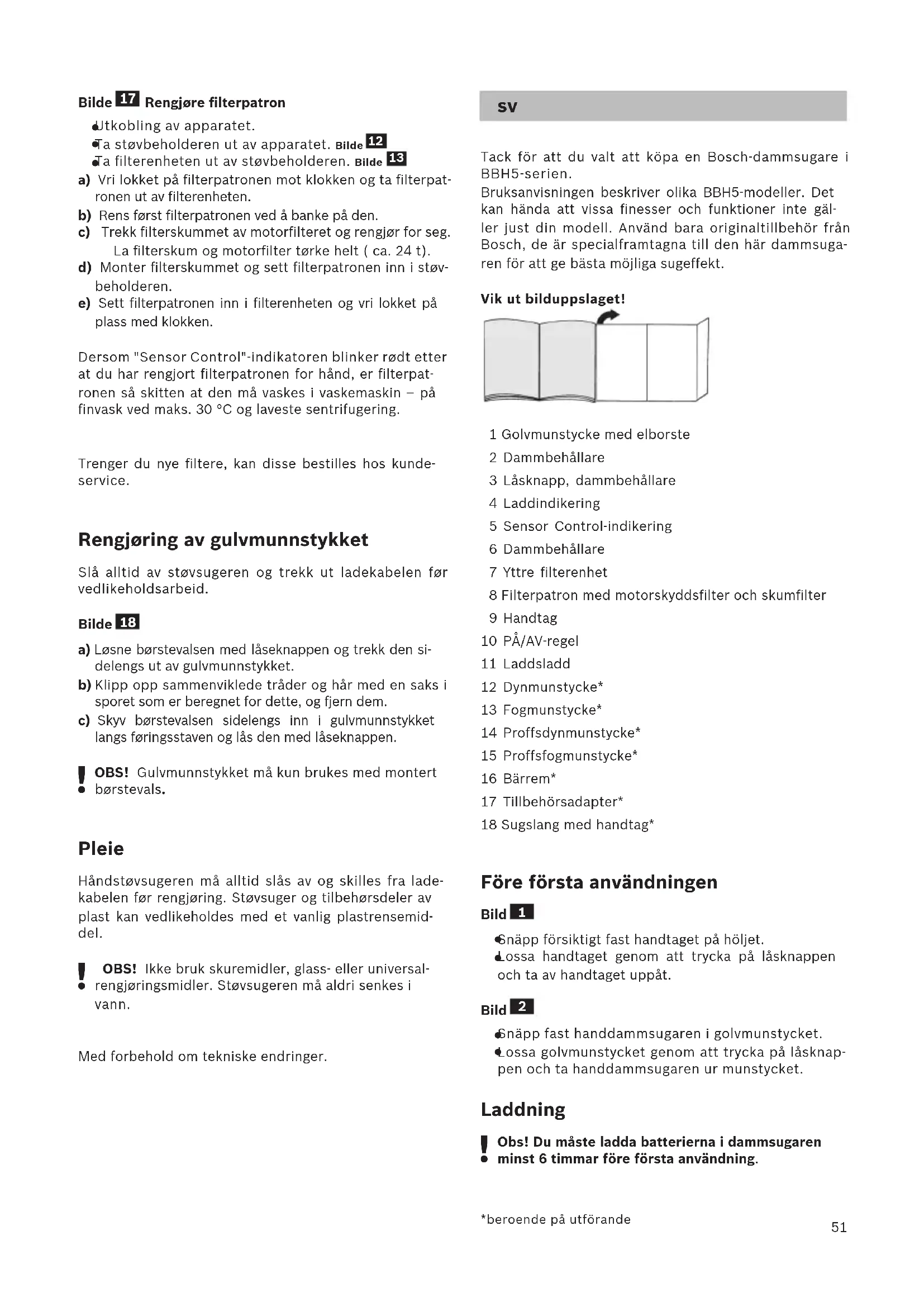 Tack för att du valt att köpa en Bosch-dammsugare i BBH5-serien. Bruksanvisningen beskriver olika BBH5-modeller. Det kan hända att vissa finesser och funktioner inte gäl- ler just din modell. Använd bara originaltillbehör från Bosch, de är specialframtagna till den här dammsuga- ren för att ge bästa möjliga sugeffekt. Vik ut bilduppslaget! 1 Golvmunstycke med elborste 2 Dammbehållare 3 Låsknapp, dammbehållare 4 Laddindikering 5 Sensor Control-indikering 6 Dammbehållare 7 Yttre filterenhet 8 Filterpatron med motorskyddsfilter och skumfilter 9 Handtag 10 PÅ/AV-regel 11 Laddsladd 12 Dynmunstycke* 13 Fogmunstycke* 14 Proffsdynmunstycke* 15 Proffsfogmunstycke* 16 Bärrem* 17 Tillbehörsadapter* 18 Sugslang med handtag* Före första användningen Bild