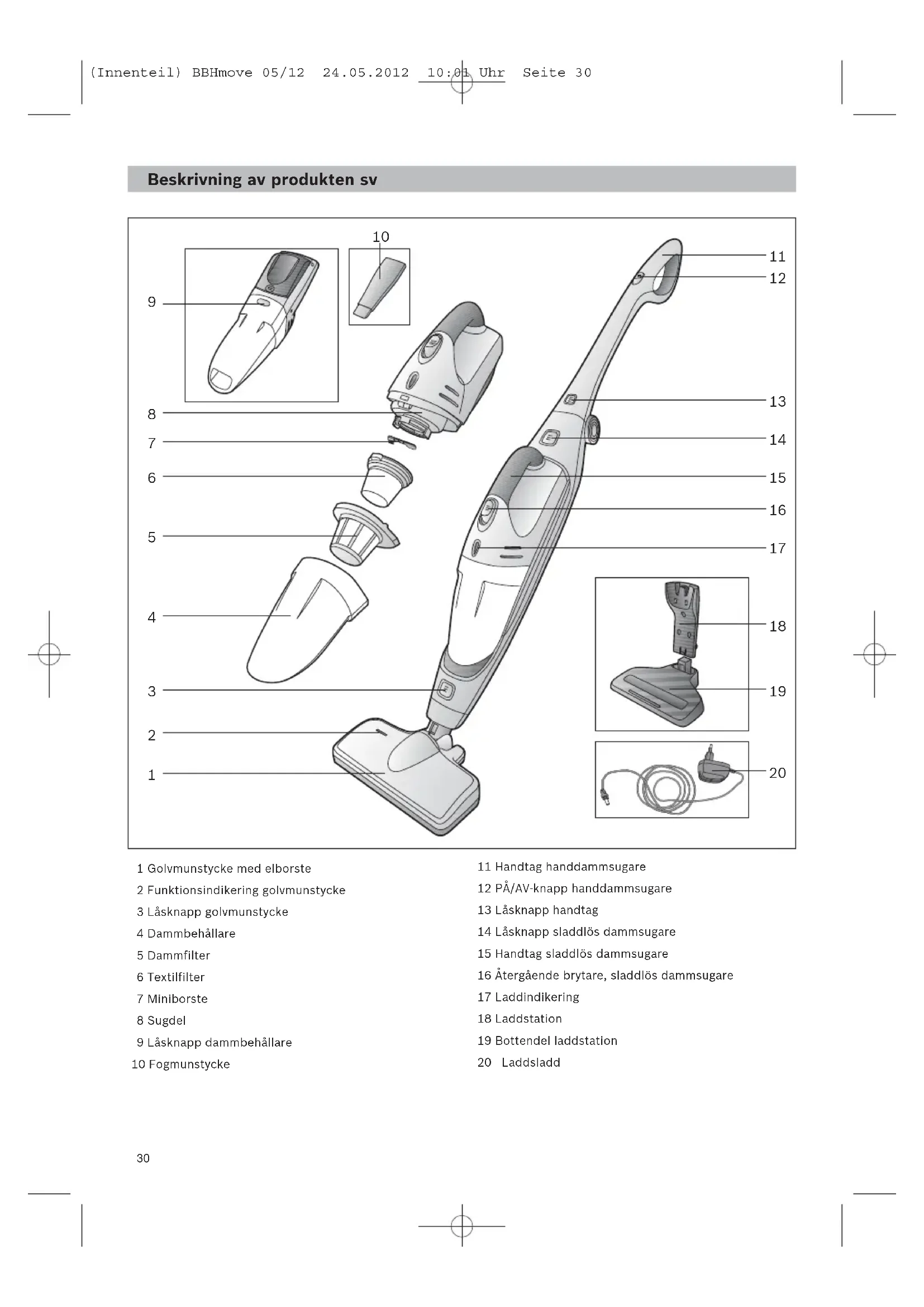 (Innenteil) BBHmove 05/12 24.05.2012 10:01 Uhr Seite 2930 Beskrivning av produkten sv 1 Golvmunstycke med elborste 2 Funktionsindikering golvmunstycke 3 Låsknapp golvmunstycke 4 Dammbehållare 5 Dammfilter 6 Textilfilter 7 Miniborste 8 Sugdel 9 Låsknapp dammbehållare 10 Fogmunstycke 11 Handtag handdammsugare 12 PÅ/AV-knapp handdammsugare 13 Låsknapp handtag 14 Låsknapp sladdlös dammsugare 15 Handtag sladdlös dammsugare 16 Återgående brytare, sladdlös dammsugare 17 Laddindikering 18 Laddstation 19 Bottendel laddstation 20 Laddsladd