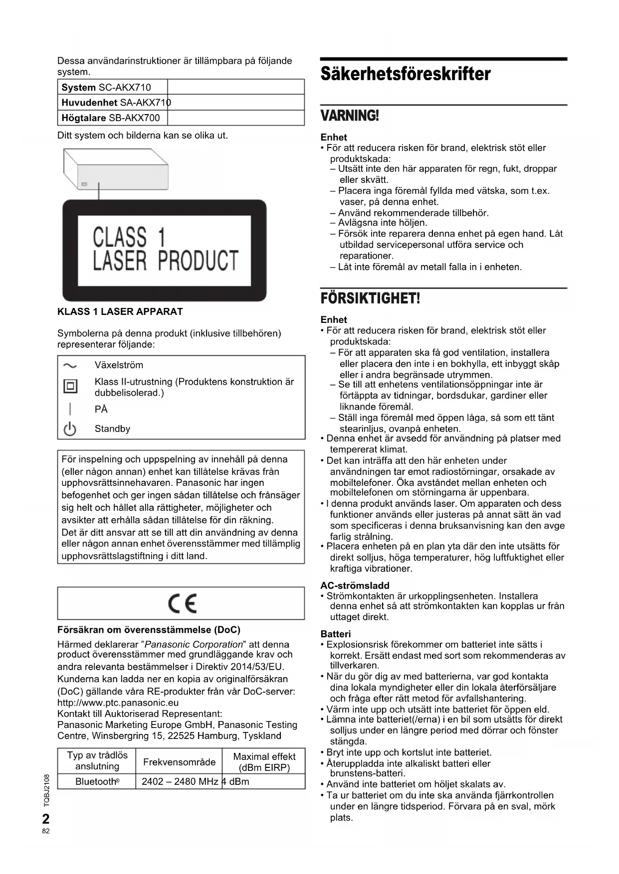 TQBJ2108 Dessa användarinstruktioner är tillämpbara på följande system.Ditt system och bilderna kan se olika ut.KLASS 1 LASER APPARATSymbolerna på denna produkt (inklusive tillbehören) representerar följande:Försäkran om överensstämmelse (DoC)Härmed deklarerar ”Panasonic Corporation” att denna product överensstämmer med grundläggande krav och andra relevanta bestämmelser i Direktiv 2014/53/EU.Kunderna kan ladda ner en kopia av originalförsäkran (DoC) gällande våra RE-produkter från vår DoC-server:http://www.ptc.panasonic.euKontakt till Auktoriserad Representant: Panasonic Marketing Europe GmbH, Panasonic Testing Centre, Winsbergring 15, 22525 Hamburg, Tyskland Säkerhetsföreskrifter VARNING! Enhet• För att reducera risken för brand, elektrisk stöt eller produktskada:– Utsätt inte den här apparaten för regn, fukt, droppar eller skvätt.– Placera inga föremål fyllda med vätska, som t.ex. vaser, på denna enhet.– Använd rekommenderade tillbehör.– Avlägsna inte höljen.– Försök inte reparera denna enhet på egen hand. Låt utbildad servicepersonal utföra service och reparationer.– Låt inte föremål av metall falla in i enheten. FÖRSIKTIGHET! Enhet• För att reducera risken för brand, elektrisk stöt eller produktskada:– För att apparaten ska få god ventilation, installera eller placera den inte i en bokhylla, ett inbyggt skåp eller i andra begränsade utrymmen. – Se till att enhetens ventilationsöppningar inte är förtäppta av tidningar, bordsdukar, gardiner eller liknande föremål.– Ställ inga föremål med öppen låga, så som ett tänt stearinljus, ovanpå enheten.• Denna enhet är avsedd för användning på platser med tempererat klimat.• Det kan inträffa att den här enheten under användningen tar emot radiostörningar, orsakade av mobiltelefoner. Öka avståndet mellan enheten och mobiltelefonen om störningarna är uppenbara.• I denna produkt används laser. Om apparaten och dess funktioner används eller justeras på annat sätt än vad som specificeras i denna bruksanvisning kan den avge farlig strålning.• Placera enheten på en plan yta där den inte utsätts för direkt solljus, höga temperaturer, hög luftfuktighet eller kraftiga vibrationer.AC-strömsladd• Strömkontakten är urkopplingsenheten. Installera denna enhet så att strömkontakten kan kopplas ur från uttaget direkt.Batteri• Explosionsrisk förekommer om batteriet inte sätts i korrekt. Ersätt endast med sort som rekommenderas av tillverkaren.• När du gör dig av med batterierna, var god kontakta dina lokala myndigheter eller din lokala återförsäljare och fråga efter rätt metod för avfallshantering.• Värm inte upp och utsätt inte batteriet för öppen eld.• Lämna inte batteriet(/erna) i en bil som utsätts för direkt solljus under en längre period med dörrar och fönster stängda.• Bryt inte upp och kortslut inte batteriet.• Återuppladda inte alkaliskt batteri eller brunstens-batteri.• Använd inte batteriet om höljet skalats av.• Ta ur batteriet om du inte ska använda fjärrkontrollen under en längre tidsperiod. Förvara på en sval, mörk plats.System SC-AKX710Huvudenhet SA-AKX710Högtalare SB-AKX700VäxelströmKlass II-utrustning (Produktens konstruktion är dubbelisolerad.) StandbyFör inspelning och uppspelning av innehåll på denna (eller någon annan) enhet kan tillåtelse krävas från upphovsrättsinnehavaren. Panasonic har ingen befogenhet och ger ingen sådan tillåtelse och frånsäger sig helt och hållet alla rättigheter, möjligheter och avsikter att erhålla sådan tillåtelse för din räkning.Det är ditt ansvar att se till att din användning av denna eller någon annan enhet överensstämmer med tillämplig upphovsrättslagstiftning i ditt land.Typ av trådlös anslutningFrekvensområdeMaximal effekt(dBm EIRP)Bluetooth 2402 – 2480 MHz 4 dBm SC-AKX710 E TQBJ2108.book Page 2 Thursday, May 3, 2018 3:48 PM offset printingConfidential Until: 23 May 2018
