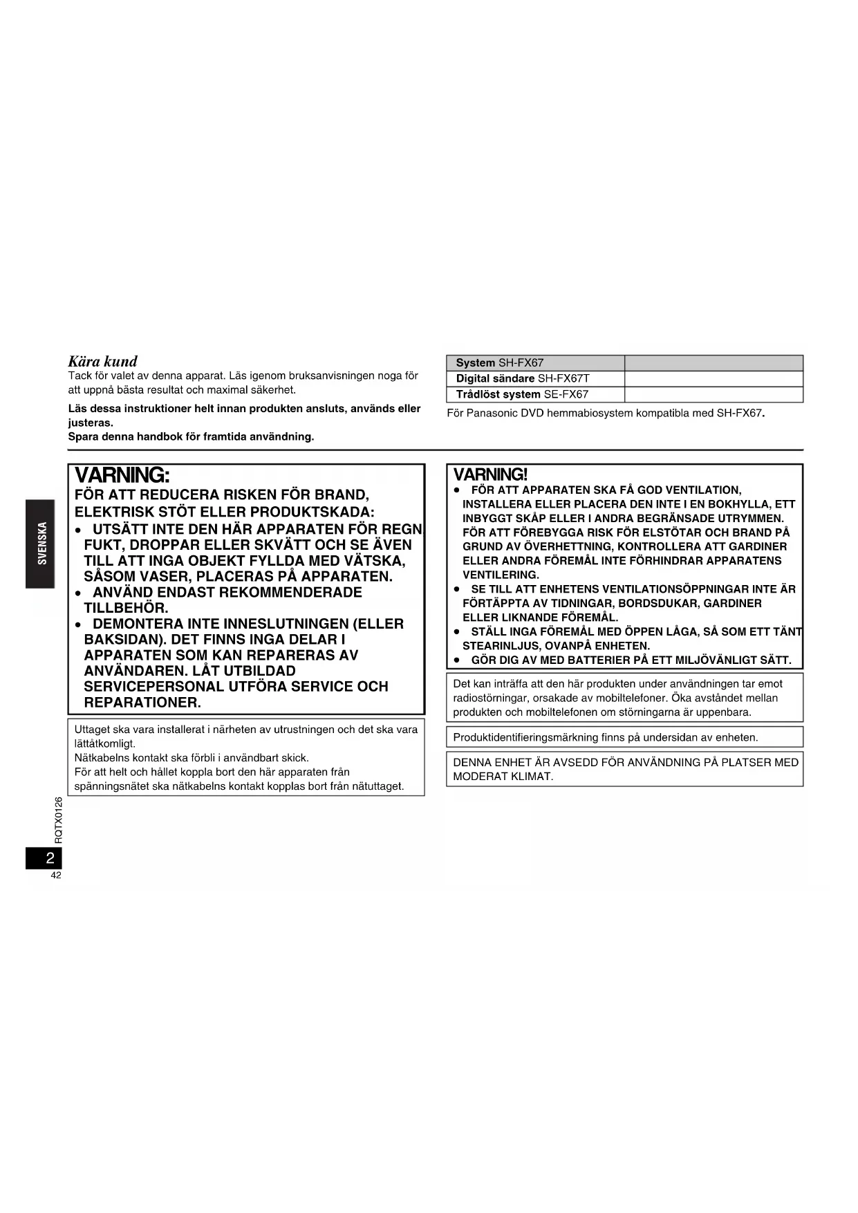 SH-FX67_RQTX0126_DU.fm Page 11 Thursday, November 29, 2007 10:13 PM2 RQTX0126 SVENSKA Kära kund Tack för valet av denna apparat. Läs igenom bruksanvisningen noga för att uppnå bästa resultat och maximal säkerhet.Läs dessa instruktioner helt innan produkten ansluts, används eller justeras.Spara denna handbok för framtida användning.För Panasonic DVD hemmabiosystem kompatibla med SH-FX67.System SH-FX67Digital sändare SH-FX67TTrådlöst system SE-FX67 VARNING: FÖR ATT REDUCERA RISKEN FÖR BRAND, ELEKTRISK STÖT ELLER PRODUKTSKADA: ≥ UTSÄTT INTE DEN HÄR APPARATEN FÖR REGN, FUKT, DROPPAR ELLER SKVÄTT OCH SE ÄVEN TILL ATT INGA OBJEKT FYLLDA MED VÄTSKA, SÅSOM VASER, PLACERAS PÅ APPARATEN.