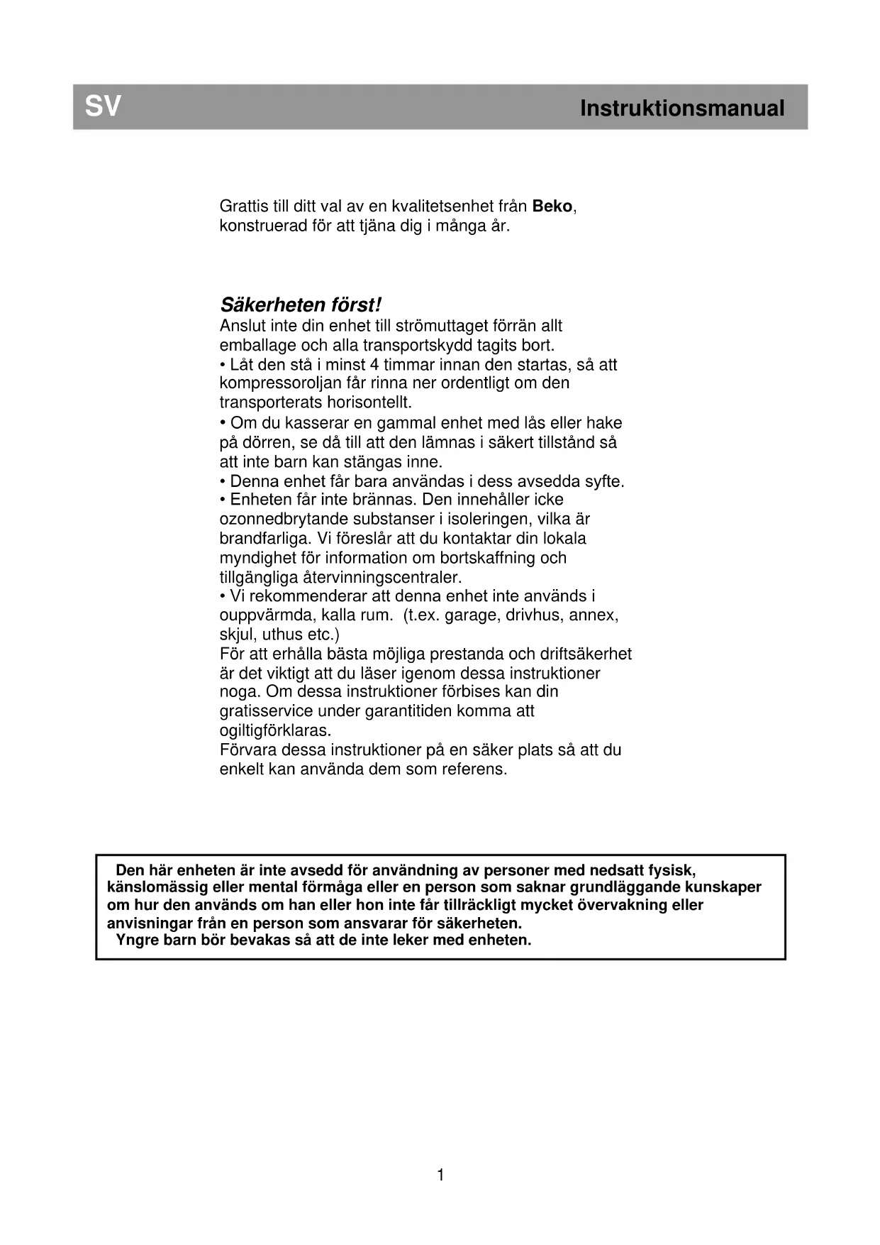 810Grattis till ditt val av en kvalitetsenhet från Beko, konstruerad för att tjäna dig i många år.