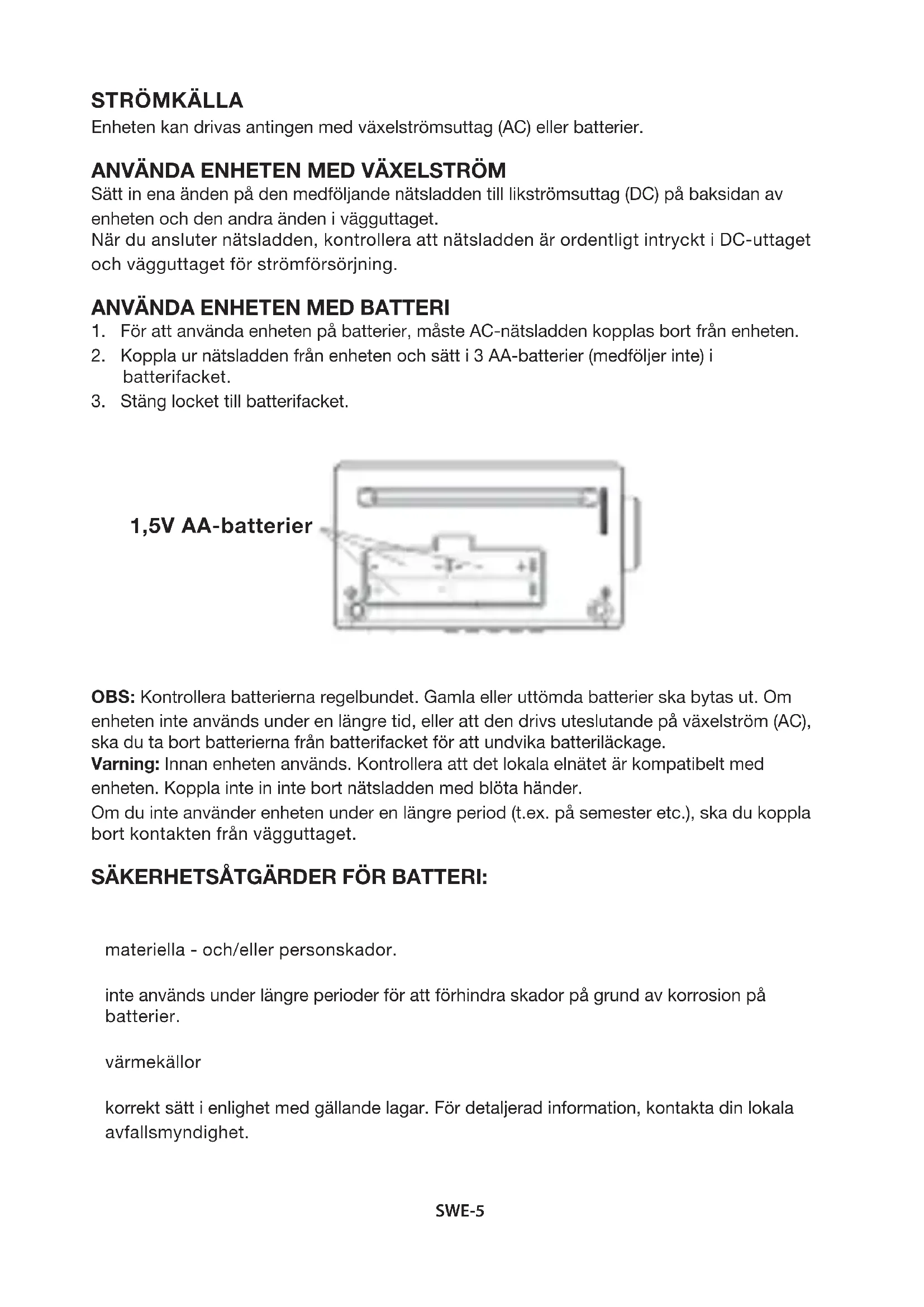 OBS: Kontrollera batterierna regelbundet. Gamla eller uttömda batterier ska bytas ut. Om enheten inte används under en längre tid, eller att den drivs uteslutande på växelström (AC), ska du ta bort batterierna från batterifacket för att undvika batteriläckage. Varning: Innan enheten används. Kontrollera att det lokala elnätet är kompatibelt med enheten. Koppla inte in inte bort nätsladden med blöta händer. Om du inte använder enheten under en längre period (t.ex. på semester etc.), ska du koppla bort kontakten från vägguttaget. SÄKERHETSÅTGÄRDER FÖR BATTERI: