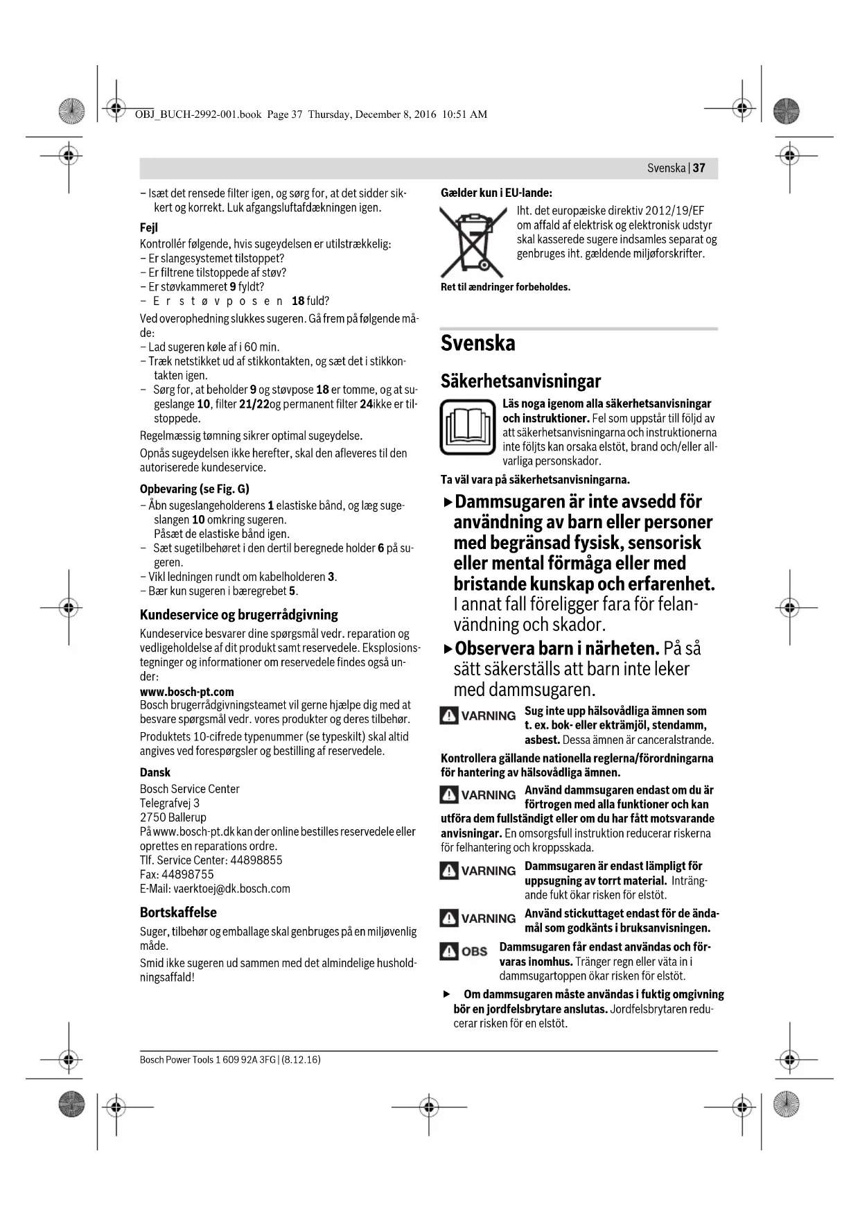 - Uppgifter om elverktygets tillåtna anslutningseffekt (landsspecifikt) –För att starta sugen sätter du driftssätts-väl- jarbrytaren 2 på symbolen ”Suga”. –För att stänga av sugen sätter du driftssätts- väljarbrytaren 2 på symbolen ”Stänga av”. – För att ta sugens start/stopp-auto- matik i drift sätts driftssätts-väljar- brytaren 2 på symbolen ”Start-/ Stopp-automatik”. OBJ_BUCH-2992-001.book Page 39 Thursday, December 8, 2016 10:51 AM40 | Norsk 1 609 92A 3FG | (8.12.16) Bosch Power Tools Underhåll och service Underhåll och rengöring Dra stickproppen ur nätuttaget innan arbeten utförs på dammsugaren. Håll dammsugaren och dess ventilationsöppningar rena för bra och säkert arbete. Om nätsladden för bibehållande av verktygets säkerhet måste bytas ut, ska byte ske hos Bosch eller en auktoriserad serviceverkstad för Bosch-elverktyg. Rengör filterenheten (se bilderna E1–E3) – Tryck på upplåsningsknappen 8 och dra dammbehållaren 9 ut dammsugaren. – Ta ut textilfiltret 21 tillsammans med filterkorgen och bor- sta av textilfiltret med en mjuk borste. – Ta tag i planfiltret 22 på lamellerna och ta ut det tillsam- mans med filterkorgen. Borsta av planfiltret med en mjuk borste eller spola det under rinnande vatten och låt det torka ordentligt. – Sätt in det rengjorda filtret igen och se till att det sitter säkert och korrekt. Rengöra dammbehållaren – Torka av dammbehållaren 9 då och då med vanligt rengö- ringsmedel utan slipmedel och låt det torka ordentligt. Rengör permanentfiltret (se bild F) Rengör permanentfiltret 24 då och då för att uppnå optimal effekt hos dammsugaren. – Öppna frånluftslocket 23 och ta ut permanentfiltret 24. – Spola av permanentfiltret 24 under rinnande vatten och låt det torka ordentligt. – Sätt in det rengjorda filtret igen och se till att det sitter säkert och korrekt. Stäng frånluftslocket igen. Störningar Kontrollera vid nedsatt sugeffekt: – Är slangsystemet tilltäppt? – Är filtret igensatt av damm? – Är dammbehållaren 9 full? – Är dammpåsen 18 full? Vid överhettning stängs dammsugaren av. Utför följande: – Låt dammsugaren svalna i 60 min. – Dra ut kontakten från uttaget och sätt in den på nytt. – Se till att behållaren 9 och dammpåsen 18 är tomma och att sugslangen 10, filtret 21/22 och permanentfiltret 24 inte är igensatta. Regelbunden tömning garanterar optimal sugeffekt. Om sugeffekten inte uppnås efter dessa åtgärder, ska damm- sugaren skickas till kundservicen. Förvaring (se bild G) – Öppna de elastiska banden på utsugsslangens hållare 1 och lägg utsugsslangen 10 runt dammsugaren. Sätt in de elastiska banden igen. – Sätt in tillbehören i avsedd hållare 6 på dammsugaren. – Linda upp nätsladden kring kabelhållaren 3. – Dammsugaren får endast bäras i handtaget 5. Kundtjänst och användarrådgivning Kundservicen ger svar på frågor beträffande reparation och underhåll av produkter och reservdelar. Sprängskisser och information om reservdelar hittar du på: www.bosch-pt.com Bosch användarrådgivningsteamet hjälper gärna vid frågor som gäller våra produkter och tillbehör. Ange alltid vid förfrågningar och reservdelsbeställningar det 10-siffriga produktnumret som finns på produktens typskylt. Svenska Bosch Service Center Telegrafvej 3 2750 Ballerup Danmark Tel.: (08) 7501820 (inom Sverige) Fax: (011) 187691 Avfallshantering Dammsugaren, tillbehör och förpackning ska omhändertas på miljövänligt sätt för återvinning. Släng inte dammsugaren i hushållsavfall! Endast för EU-länder: Enligt EU-direktivet 2012/19/EU om avfall som utgörs av eller innehåller elektrisk och elektronisk utrustning och dess tillämning i nationell lag ska förbrukade dammsugare sorteras och återvinnas separat. Ändringar förbehålles. Norsk Sikkerhetsinformasjon Les gjennom alle advarslene og anvisninge- ne. Feil ved overholdelsen av advarslene og nedenstående anvisninger kan medføre elek- triske støt, brann og/eller alvorlige skader. Ta godt vare på disse informasjonene. Sugeren er ikke beregnet brukt av barn og personer med reduserte fy- siske eller sansemessige evner el- ler med manglende erfaring og kunnskap. Ellers er det fare for feil- betjening og personskader. Må plasseres utilgjengelig for barn. På den måten unngår du at barn leker med sugeren. –För att stänga av sugen sätter du driftssätts- väljarbrytaren 2 på symbolen ”Stänga av”. OBJ_BUCH-2992-001.book Page 40 Thursday, December 8, 2016 10:51 AMNorsk | 41 Bosch Power Tools 1 609 92A 3FG | (8.12.16) Sug ikke opp helsefarlige stoffer, f. eks. bøk- eller eikestøv, steinstøv, asbest. Disse stoffene gjelder som kreftfremkallende. Informer deg om de gyldige bestemmelser/lover i ditt land angående håndteringen av helsefarlige støv. Bruk sugeren kun hvis du kan beregne alle funksjonene og kan utføre dissse uten innskrenkninger eller har fått tilsvarende instrukser. En omhyggelig opplæring reduserer faren for feil bruk og ska- der. Sugeren er kun egnet til suging av tør- re stoffer. Hvis væsker kommer inn i den, øker faren for elektrisk støt. Bruk stikkontakten kun til de formål som er angitt i driftsinstruksen. Sugeren må bare brukes og oppbevares i in- nerom. Dersom regn eller fuktighet trenger inn i sugerens overdel øker dette risikoen for elektrisk støt. Hvis det ikke kan unngås å bruke sugeren i fuktige om- givelser, må du bruke en jordfeilbryter. Bruk av en jord- feilbryter reduserer risikoen for elektriske støt. Sugeren kobles til et korrekt jordet strømnett. Stikkon- takt og skjøteledning må ha en funksjonsdyktig jordled- ning. Før hver bruk må du kontrollere sugeren, ledningen og støpselet. Ikke bruk sugeren hvis du registrerer ska- der. Du må ikke åpne sugeren selv og la den alltid kun repareres av kvalifisert fagpersonale og kun med origi- nale reservedeler. Skadet suger, ledning og støpsel øker ri