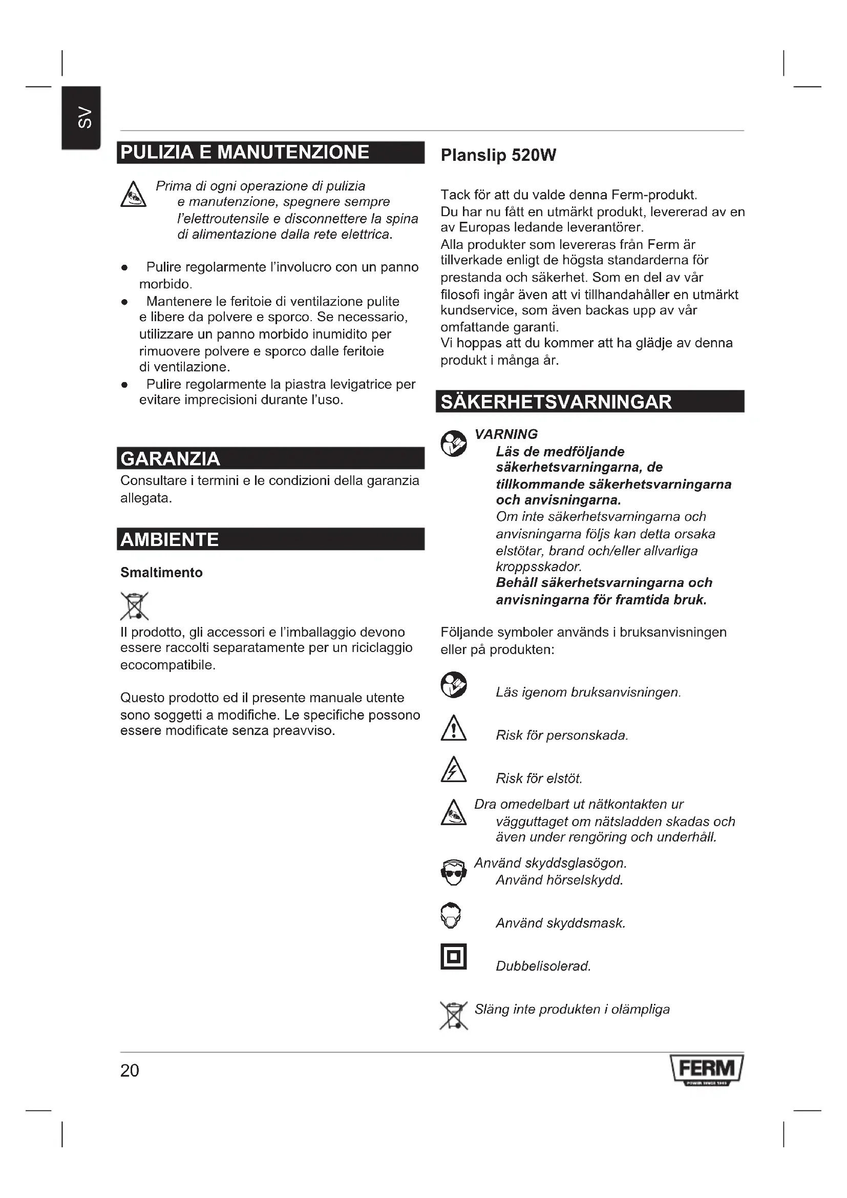 Innan rengöring och underhåll ska du alltid stänga av maskinen och dra ut nätkontakten ur vägguttaget. ● Rengörhöljetregelbundetmedenmjuktrasa. ● Setillattventilationshålenärfriafråndamm ochsmuts.Användvidbehovenmjuk,fuktig trasaföratttabortdammochsmutsfrån ventilationshålen. ● Rengörslipdynanregelbundetförattundvika onoggrannhetvidanvändning. GARANTI Se de medföljande garantivillkoren. MILJÖ Bortskaffning Produkten,tillbehörenochförpackningenmåste sorterasförmiljövänligåtervinning. Medförbehållförändringariproduktenoch bruksanvisningen.Specikationerkanändras utan förvarning.23