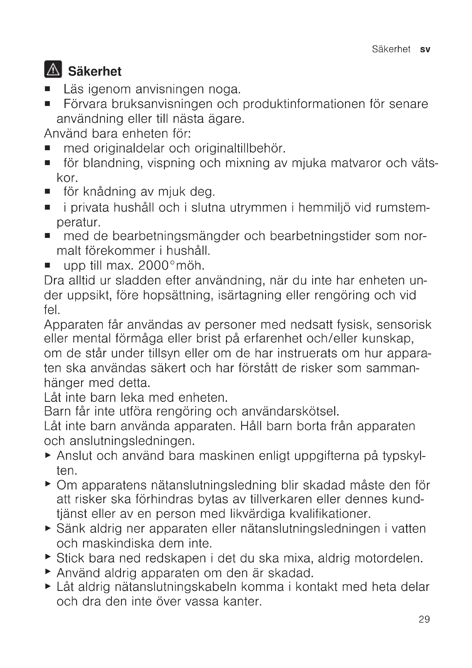 Säkerhet ¡ Läs igenom anvisningen noga. ¡ Förvara bruksanvisningen och produktinformationen för senare användning eller till nästa ägare. Använd bara enheten för: ¡ med originaldelar och originaltillbehör. ¡ för blandning, vispning och mixning av mjuka matvaror och väts- kor. ¡ för knådning av mjuk deg. ¡ i privata hushåll och i slutna utrymmen i hemmiljö vid rumstem- peratur. ¡ med de bearbetningsmängder och bearbetningstider som nor- malt förekommer i hushåll. ¡ upp till max. 2000°möh. Dra alltid ur sladden efter användning, när du inte har enheten un- der uppsikt, före hopsättning, isärtagning eller rengöring och vid fel. Apparaten får användas av personer med nedsatt fysisk, sensorisk eller mental förmåga eller brist på erfarenhet och/eller kunskap, om de står under tillsyn eller om de har instruerats om hur appara- ten ska användas säkert och har förstått de risker som samman- hänger med detta. Låt inte barn leka med enheten. Barn får inte utföra rengöring och användarskötsel. Låt inte barn använda apparaten. Håll barn borta från apparaten och anslutningsledningen.