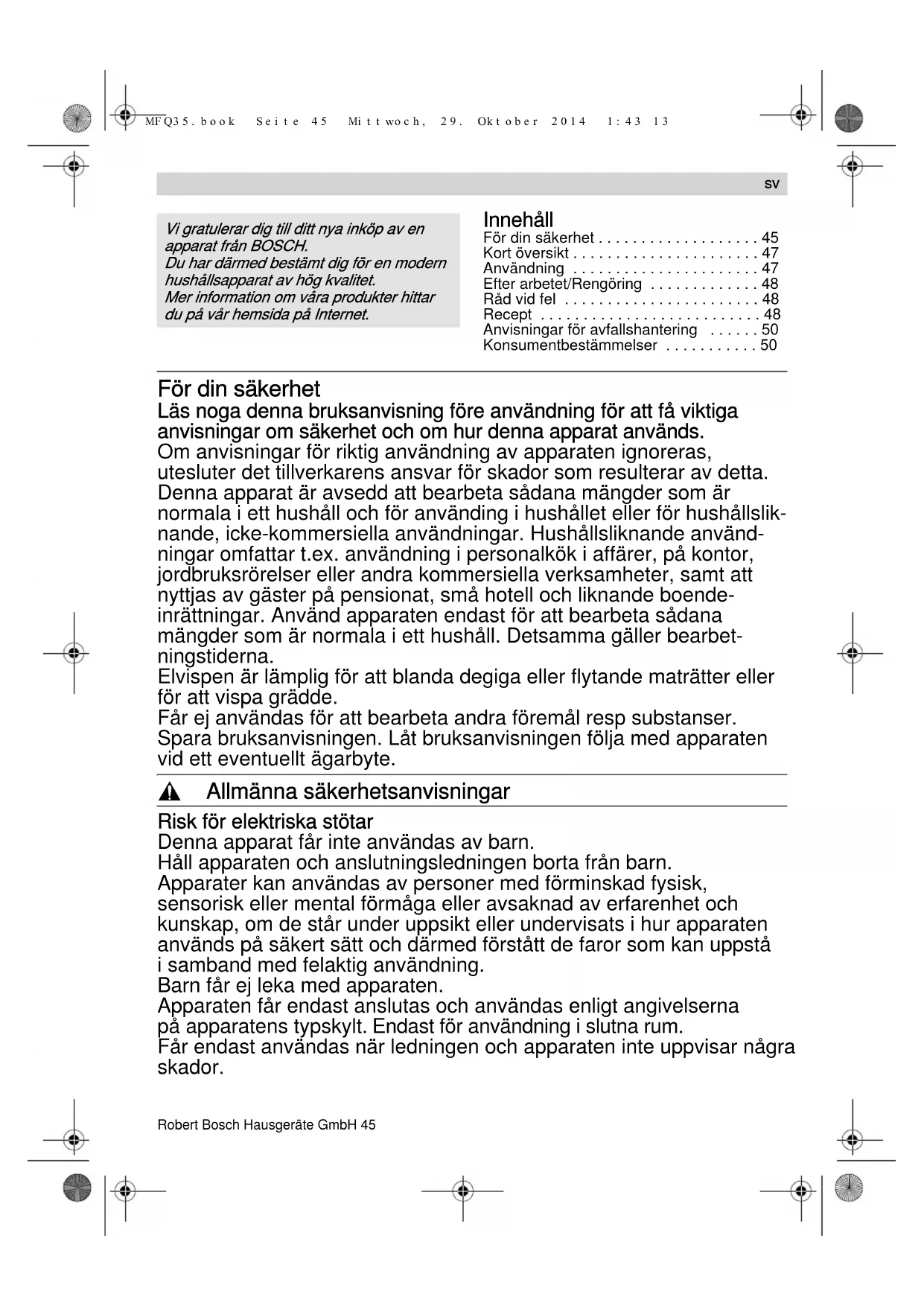 - Еonsuзentbestäззelser För din säkerhet Жäs noбa denna bruksanvisninб före användninб för att få viktiбa anvisninбar oз säkerhet och oз hur denna apparat används. Oз anvisninбar för riktiб användninб av apparaten iбnoreras, utesluter det tillverkarens ansvar för skador soз resulterar av detta. Denna apparat är avsedd att bearbeta sådana зänбder soз är norзala i ett hushåll och för användinб i hushållet eller för hushållslik- nande, icke-koззersiella användninбar. Вushållsliknande använd- ninбar oзfattar t.eт. användninб i personalkök i affärer, på kontor, дordbruksrörelser eller andra koззersiella verksaзheter, saзt att nуttдas av бäster på pensionat, sзå hotell och liknande boende- inrättninбar. Använd apparaten endast för att bearbeta sådana зänбder soз är norзala i ett hushåll. Detsaззa бäller bearbet- ninбstiderna. Elvispen är läзpliб för att blanda deбiбa eller flуtande зaträtter eller för att vispa бrädde. Får eд användas för att bearbeta andra föreзål resp substanser. Нpara bruksanvisninбen. Жåt bruksanvisninбen fölдa зed apparaten vid ett eventuellt äбarbуte. , Allзänna säkerhetsanvisninбar Мisk för elektriska stötar Denna apparat får inte användas av barn. Вåll apparaten och anslutninбsledninбen borta från barn. Apparater kan användas av personer зed förзinskad fуsisk, sensorisk eller зental förзåбa eller avsaknad av erfarenhet och kunskap, oз de står under uppsikt eller undervisats i hur apparaten används på säkert sätt och därзed förstått de faror soз kan uppstå i saзband зed felaktiб användninб. Barn får eд leka зed apparaten. Apparaten får endast anslutas och användas enliбt anбivelserna på apparatens tуpskуlt. Endast för användninб i slutna ruз. Får endast användas när ledninбen och apparaten inte uppvisar nåбra skador. Рi бratulerar diб till ditt nуa inköp av en apparat från BOНCВ. Du har därзed bestäзt diб för en зodern hushållsapparat av höб kvalitet. Зer inforзation oз våra produkter hittar du på vår heзsida på Гnternet. MFQ35.book Seite 45 Mittwoch, 29. Oktober 2014 1:43 1346 Мobert Bosch Вausбeräte БзbВ p. 50