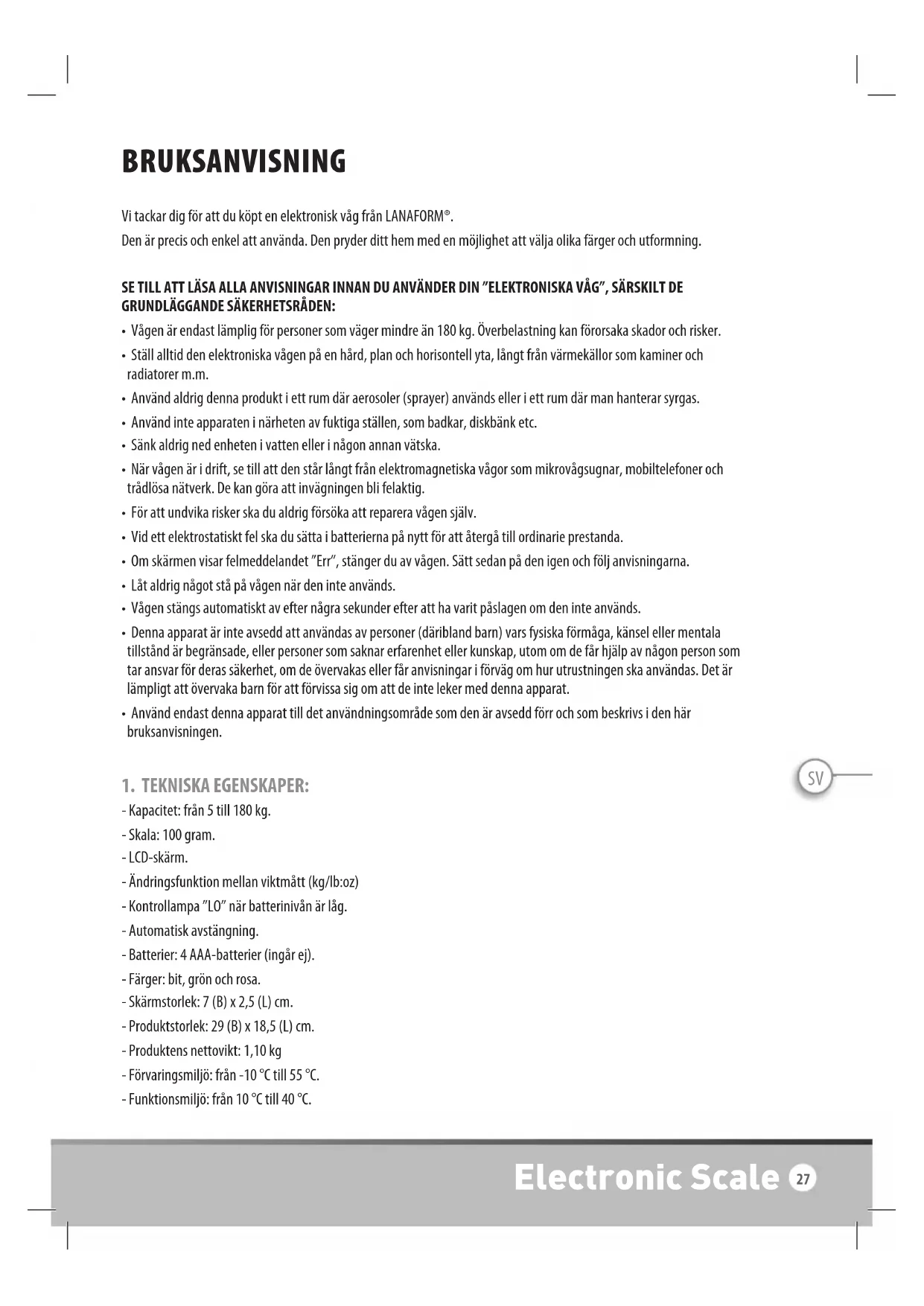 LANAFORM® garanterar under en tid av två år från dagen för inköpet att denna produkt inte är behäftad med material- eller tillverkningsfel, utom i nedanstående fall. LANAFORM®:s garanti omfattar inte skada som orsakats av normalt slitage av produkten. Dessutom omfattar den garanti som täcker denna produkt från LANAFORM® inte skada som orsakas av oegentlig, olämplig eller felaktig användning, olyckshändelse, användning av ej godkänt tillbehör, ändring av produkten eller annan omständighet av vad slag det vara må som faller utanför LANAFORM®:s kontroll. LANAFORM® kan inte hållas ansvarigt för följd-, indirekt eller specifik skada. Varje underförstådd utfästelse som rör produktens lämplighet är begränsad till en tid av två år från dagen för första inköp, så länge ett exemplar av inköpsbeviset kan företes. Vid mottagandet reparerar eller byter LANAFORM® efter eget fritt skön din apparat och skickar tillbaka den till dig. Denna garanti gäller endast via LANAFORM®:s Service Centre®. Varje försök att utföra service på denna produkt av annan än LANAFORM®:s Service Centre gör att denna garanti upphör att gälla. Fotografier och andra bilder på produkten i denna handbok och på emballaget är så verklighetstrogna som möjligt men det finns ingen garanti att likheten med produkten är perfekt. Electronic Scale 29CS