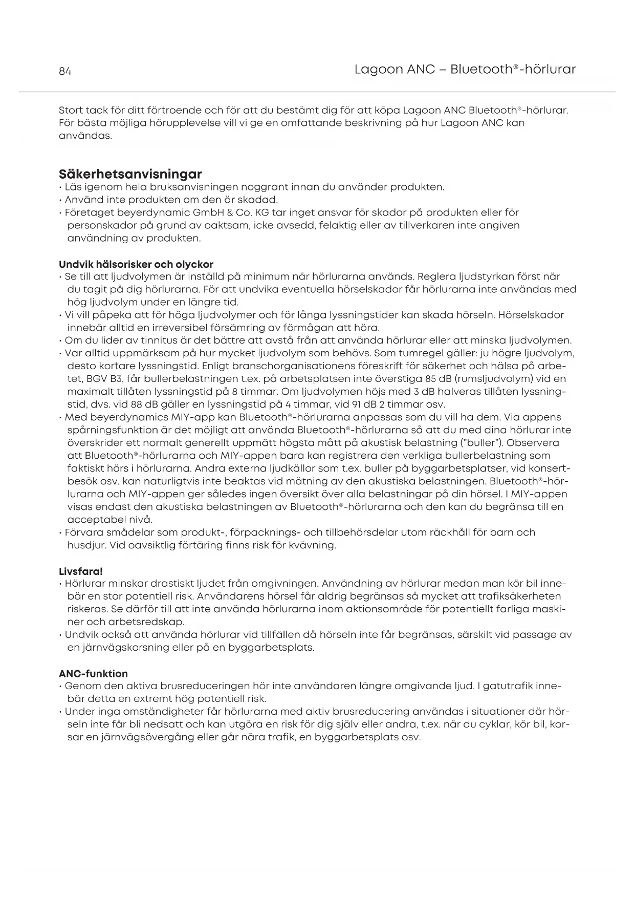 Sto tack för ditt föroende och för att du beämt dig för att köpa Lagoon ANC Bluetooth®-hörlurar. För bäa möjliga hörupplevelse vill vi ge en omfattande beskrivning på hur Lagoon ANC kan användas. Säkerhetsanvisningar
