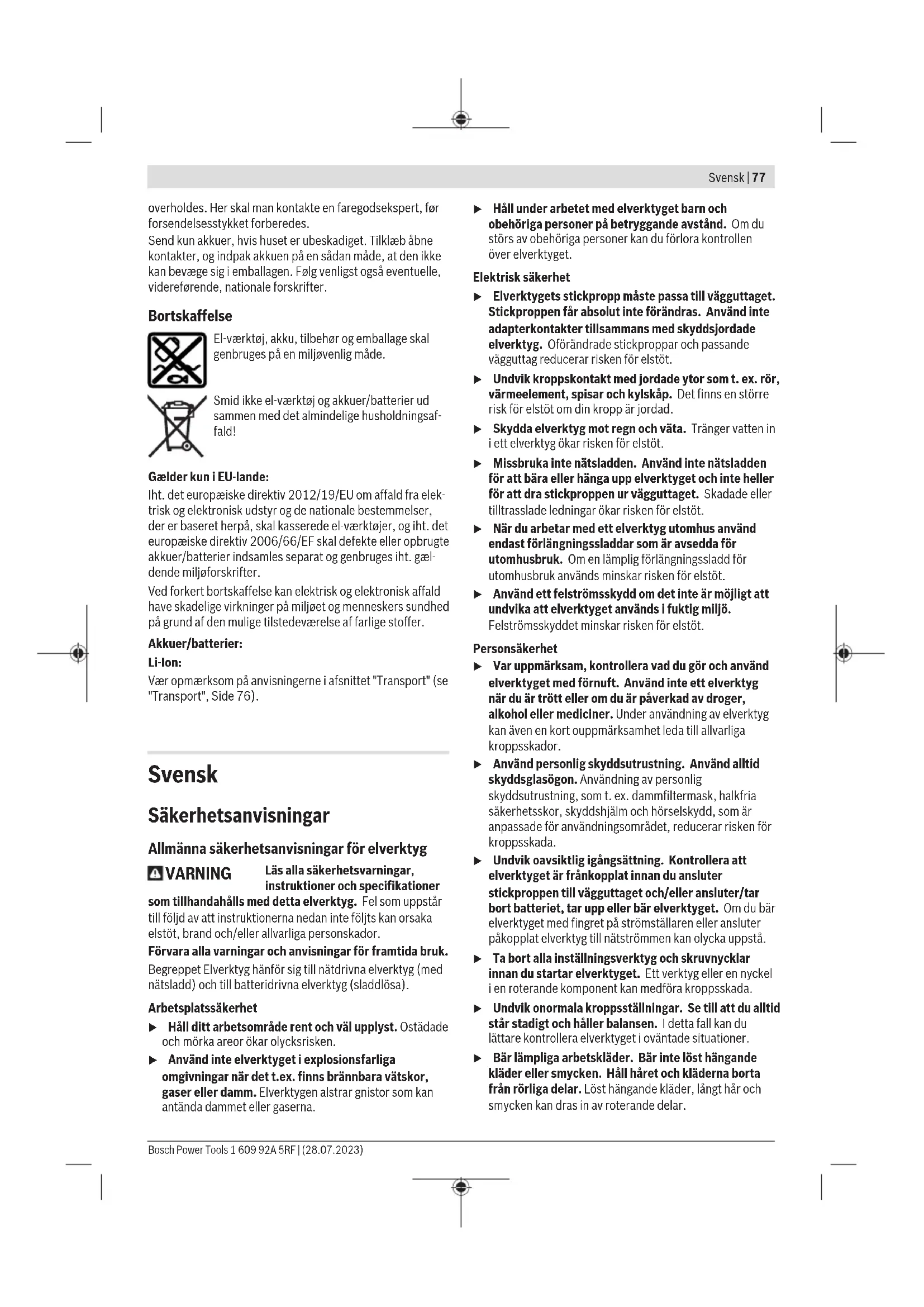Den vibrationsnivå och det bullervärde som anges i dessa anvisningar har uppmätts enligt en mätmetod som normerats och kan användas för att jämföra elverktyg med varandra. Mätmetoden är även lämplig för preliminär bedömning av vibrations- och bullernivån. Den angivna vibrations- och bullernivån representerar den huvudsakliga användningen av elverktyget. Om däremot elverktyget används för andra ändamål, med andra insatsverktyg eller inte underhållits ordentligt kan vibrations- och bullernivån avvika. Då kan vibrations- och bullernivån under arbetsperioden öka betydligt under hela arbetstiden. För en exakt bedömning av vibrations- och bullernivån bör även de tider beaktas när elverktyget är avstängt eller är igång, men inte används. Detta reducerar vibrations- och bullerbelastningen för den totala arbetsperioden betydligt. Bestäm extra säkerhetsåtgärder för att skydda operatören mot vibrationernas inverkan t.ex.: underhåll av elverktyget och insatsverktygen, att hålla händerna varma, organisation av arbetsförloppen. Batteri Bosch säljer batteridrivna elverktyg även utan batteri. Om det ingår ett batteri i leveransen av ditt elverktyg kan du se på förpackningen. Ladda batteriet u Använd endast de laddare som anges i tekniska data. Endast denna typ av laddare är anpassad till det litium- jonbatteri som används i elverktyget. Observera: litiumjonbatterier levereras delvis laddade enligt internationella transportföreskrifter. För full effekt ska batteriet laddas helt innan första användningen. Sätta in batteriet Skjut in det laddade batteriet i batterihållaren tills det sitter fast. Borttagning av batteri För att ta ut batteriet, tryck på upplåsningsknappen och dra ut batteriet. Bruka inte våld. Bosch Power Tools 1 609 92A 5RF | (28.07.2023)82 | Svensk Indikering batteristatus De tre gröna LED-lamporna för batteriets laddindikering visar batteristatus. Indikeringen för laddstatus lyser endast i 3sekunder efter start. LED Kapacitet Fast ljus 3× grönt 60–100% Fast ljus 2× grönt 30–60% Fast ljus 1× grönt 5–30% Blinkande ljus 1× grönt 0–5% Temperaturberoende överbelastningsskydd Elverktyget kan inte överbelastas om användning sker enligt föreskrifterna. Vid för kraftig belastning eller om tillåtet batteritemperaturintervall inte beaktas reduceras varvtalet, eller elverktyget stängs av. Vid reducerat varvtal går elverktyget med fullt varvtal igen först då tillåten batteritemperatur har uppnåtts. Vid automatisk avstängning, stäng av elverktyget, låt batteriet svalna och slå på elverktyget igen. Indikering för temperaturövervakning/ överbelastningsskydd Den röda lysdiodenhjälper dig att skydda batteriet mot överhettning och motorn mot överbelastning. Om lysdioden lyser fast rött är batteriets temperatur för hög och elverktyget stängs av automatiskt. – Stäng av elverktyget. – Låt batteriet svalna innan du fortsätter arbetet. Om lysdioden blinkar rött är elverktyget blockerat och stängs av automatiskt. Dra ut elverktyget ur arbetsstycket. Så snart blockeringen har lossats arbetar elverktyget vidare. Anvisningar för korrekt hantering av batterimodulen Skydda batterimodulen mot fukt och vatten. Batteriet får endast lagras inom ett temperaturområde mellan –20 °C till 50 °C. Låt därför inte batterimodulen t. ex. på sommaren ligga kvar i bilen. Är brukstiden efter uppladdning onormalt kort tyder det på att batterierna är förbrukade och måste bytas mot nya. Beakta anvisningarna för avfallshantering. Montage Montera skyddsanordning u Ta bort batteriet ur elverktyget innan åtgärder utförs på elverktyget (t.ex. underhåll, verktygsbyte) samt före transport och lagring. Om strömställaren Till/Från oavsiktligt påverkas finns risk för personskada. Anmärkning: Om slipskivan brustit under drift eller stödanordningarna på spängskyddet/elverktyget skadats, måste berörda delar/elverktyget bytas ut eller för service skickas till kundtjänst. För adresser, se avsnittet "Kundtjänst och användningsrådgivning". Skyddskåpa för slipning u Använd alltid skyddskåpan vid slipning(7). Skyddskåpa vid kapning u Använd alltid skyddskåpan för kapning(10) vid kapning. u Vid kapning i sten bör en tillräckligt god dammutsugning anordnas. Montera skyddskåpan (se bild A) Skyddskåpan för kapning (10) monteras på skyddskåpan för slipning (7) så att den sitter ordentligt fast. Ställa in skyddskåpan (se bild A) Vrid skyddskåpan till önskad position så att den sitter ordentligt fast. Inga verktyg behövs. u Ställ in skyddskåpan (7) så att gnistor inte sprutas mot användaren. Montera slipverktyg u Ta bort batteriet ur elverktyget innan åtgärder utförs på elverktyget (t.ex. underhåll, verktygsbyte) samt före transport och lagring. Om strömställaren Till/Från oavsiktligt påverkas finns risk för personskada. u Rör inte slip- och kapskivorna innan de svalnat. Skivorna blir mycket heta vid arbetet. Rengör slipspindeln (8) och alla delar som ska monteras. För att spänna eller lossa slipverktygen, skjut spindellåsknappen (2) framåt och vrid samtidigt slipmaskinen så att slipspindeln sitter ordentligt fast. u Tryck ned spindellåsknappen endast när slipspindeln står stilla. I annat fall kan elverktyget skadas. Slip-/kapningsskiva Beakta slipverktygets mått. Håldiametern måste passa till upptagningsflänsen. Använd inga adaptrar eller reduceringsdelar. Var vid användningen av diamantkapskivor noga med att vridriktningspilen på diamant-kapningsskivan och elverktygets vridriktning (se vridriktningspilen på kapslingen) stämmer överens. Monteringens ordningsföljd framgår av grafiksidan. Observera: vid montering av bundna slip- eller kapskivor med hjälp av medföljande spännskruv med skiva(11) behövs inget mellanlager. För att lossa slip-/kapskivan, skjut spindellåsknappen (2) framåt och vrid samtidigt slip-/kapskivan (12) så att sli