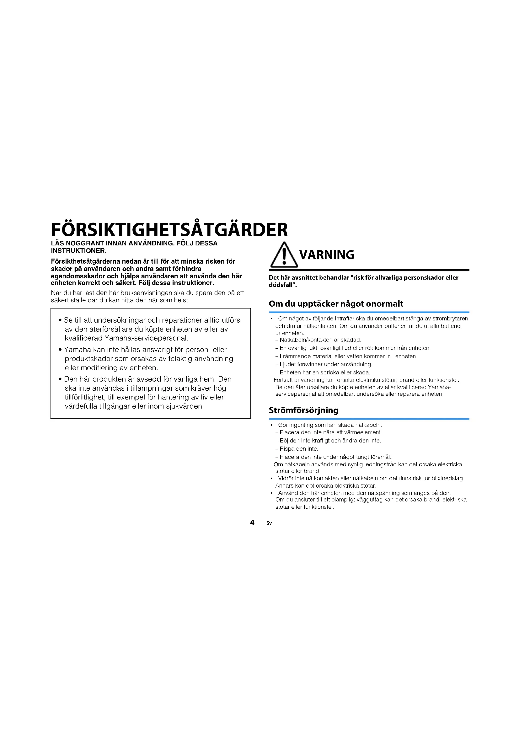 - Om något av följande inträffar ska du omedelbart stänga av strömbrytaren och dra ur nätkontakten. Om du använder batterier tar du ut alla batterierur enheten.– Nätkabeln/kontakten är skadad. – En ovanlig lukt, ovanligt ljud eller rök kommer från enheten. – Främmande material eller vatten kommer in i enheten.– Ljudet försvinner under användning.– Enheten har en spricka eller skada. Fortsatt användning kan orsaka elektriska stötar, brand eller funktionsfel. Be den återförsäljare du köpte enheten av eller kvalificerad Yamaha-servicepersonal att omedelbart undersöka eller reparera enheten. Strömförsörjning