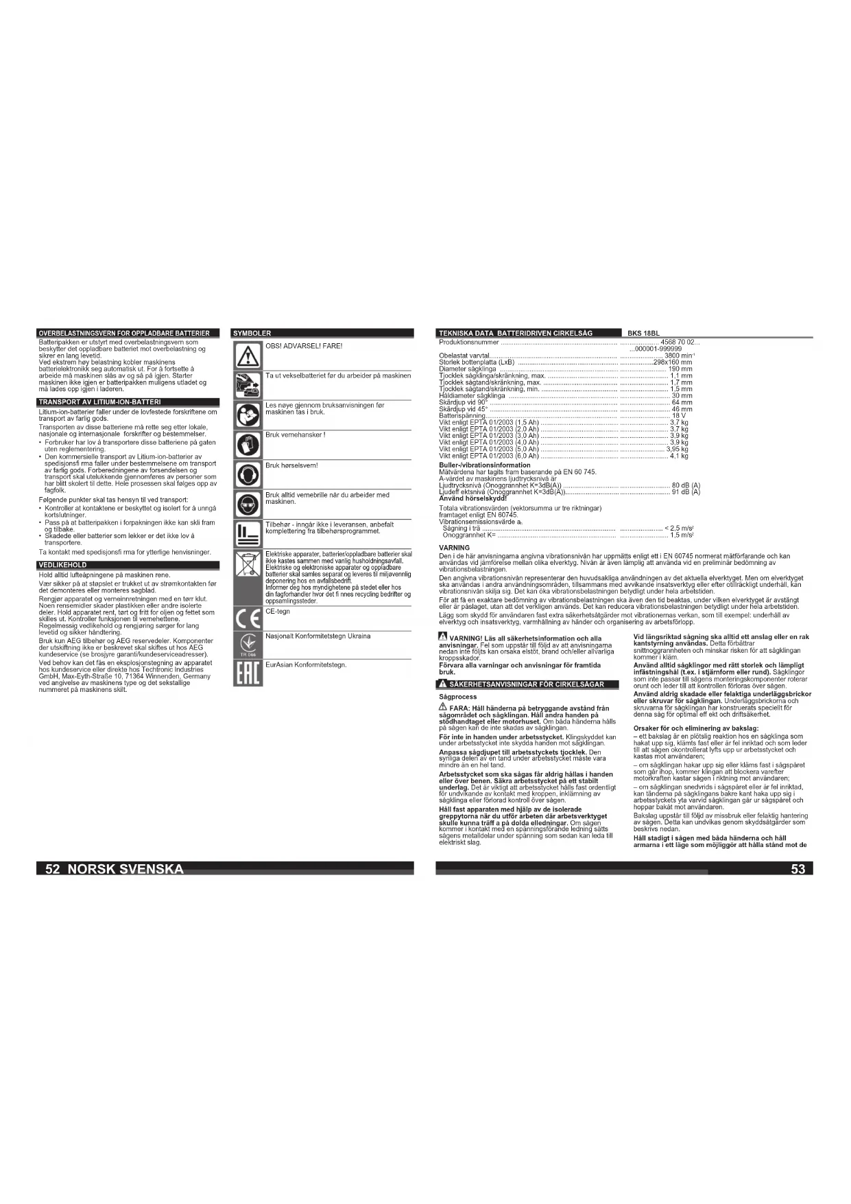 - Transportera aldrig batterier som läcker, har runnit ut eller är skadade. För mer information vänligen kontakta din speditionsfi rma. SKÖTSEL Se till att motorhöljets luftslitsar är rena. Koppla alltid bort verktyget från eluttaget innan du sätter dit eller tar bort sågklingan. Rengör både verktyget och skyddsanordningen med en torr trasa. En del rengöringsmedel skadar plastmaterialet eller andra isolerade delar på verktyget. Se till att verktyget alltid är rent och torrt samt fri från olja eller fett. Kontrollera alltid skyddskåparnas felfria funktion. Regelbundet underhåll och regelbunden rengöring är förutsättning för en lång livslängd och säker användning. Använd endast AEG-tillbehör och AEG-reservdelar. Komponenter, för vilka inget byte beskrivs, skall bytas ut hos AEG-kundtjänst (se broschyren garanti-/ kundtjänstadresser). Vid behov kan du rekvirera apparatens sprängskiss antingen hos kundservicen eller direkt hos Techtronic Industries GmbH, Max-Eyth-Straße 10, 71364 Winnenden, Germany. Du ska då ange maskintypen och numret på sex siff ror som står på eff ektskylten. SYMBOLER OBSERVERA! VARNING! FARA! Drag ur batteripaket innan arbete utföres på maskinen. Läs instruktionen noga innan du startar maskinen. Bär skyddshandskar! Använd hörselskydd! Använd alltid skyddsglasögon. Tillbehör - Ingår ej i leveransomfånget, erhålles som tillbehör. Elektriska maskiner, batterier/uppladdningsbara batterier och får inte slängas tillsammans med de vanliga hushållssoporna. Elektriska maskiner och uppladdningsbara batterier ka samlas separat och lämnas till en avfallsstation för miljövänlig avfallshantering. Kontakta den lokala myndigheten respektive kommunen eller fråga återförsäljare var det fi nns speciella avfallsstationer för elskrot. CE-symbol Nationell symbol för överensstämmelse Ukraine EurAsian överensstämmelsesymbol.5756 BKS 18BL