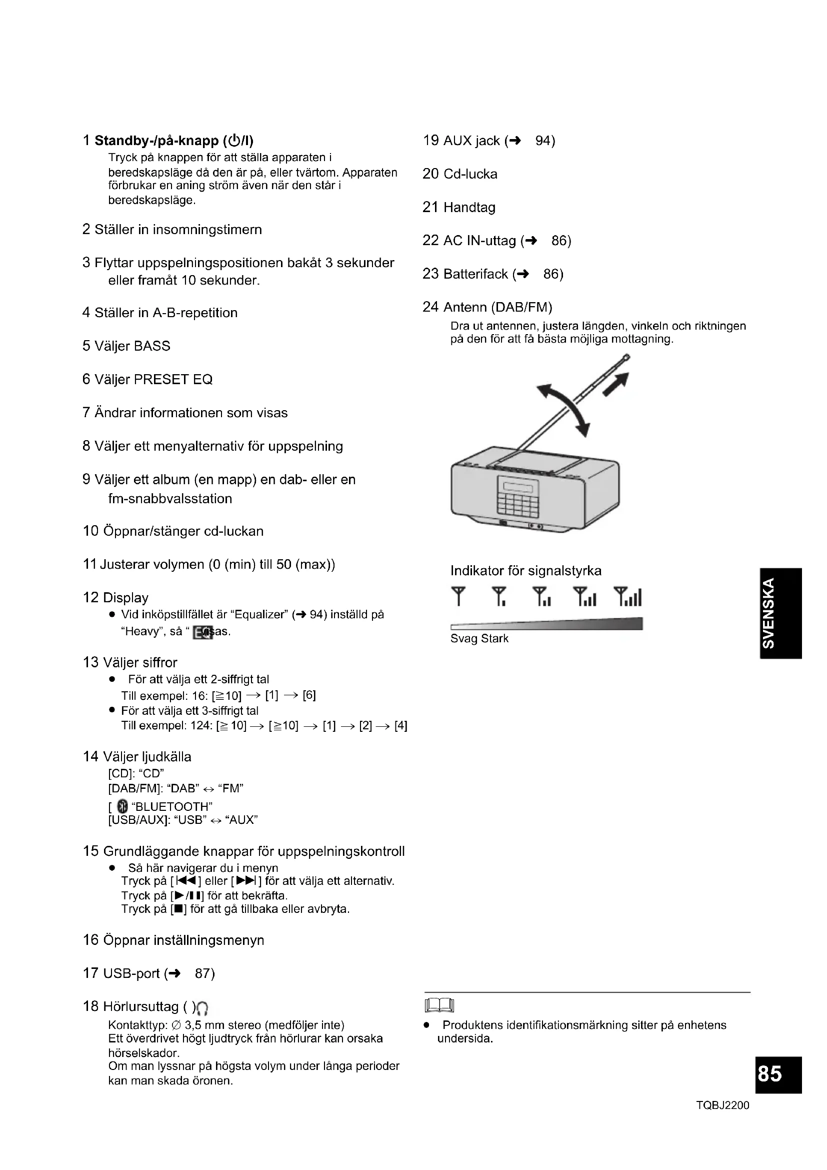 [4] 14 Väljer ljudkälla [CD]: “CD”[DAB/FM]: “DAB” ,. “FM”[ ]: “BLUETOOTH”[USB/AUX]: “USB” ,. “AUX” 15 Grundläggande knappar för uppspelningskontroll ≥ Så här navigerar du i menyn Tryck på [:] eller [9] för att välja ett alternativ. Tryck på [1/;] för att bekräfta.Tryck på [∫] för att gå tillbaka eller avbryta. 16 Öppnar inställningsmenyn 17 USB-port (l 87) 18 Hörlursuttag ( ) Kontakttyp: ‰ 3,5 mm stereo (medföljer inte)Ett överdrivet högt ljudtryck från hörlurar kan orsaka hörselskador.Om man lyssnar på högsta volym under långa perioder kan man skada öronen. 19 AUX jack (l 94) 20 Cd-lucka 21 Handtag 22 AC IN-uttag (l 86) 23 Batterifack (l 86) 24 Antenn (DAB/FM) Dra ut antennen, justera längden, vinkeln och riktningen på den för att få bästa möjliga mottagning. ≥ Produktens identifikationsmärkning sitter på enhetens undersida. Indikator för signalstyrka Svag Stark RX-D70BT-EG-TQBJ2200_LOTE.book 85 ページ 2019年4月25日 木曜日 午後1時47分86 TQBJ2200 Strömkällor Sätt i nätsladden ordentligt i apparaten och i vägguttaget. ≥ Använd endast den medföljande AC-kabeln.≥ Apparaten visar tid och datum i standbyläge (endast när apparaten får ström via elnätet).Den här apparaten använder batterier som strömkälla när du drar ur nätsladden.Använd alkaliska batterier eller manganbatterier. Sätt i batterierna så att polerna (r och s) stämmer med de i apparaten. ∫ Ta ur batterierna När du tar ur den inre raden batterier, trycker du på änden med “s”-polen på det tredje batteriet så att dess “r”-pol skjuter ut och gör det lättare att ta bort batterierna. ∫ Batteriindikator Batteriindikatorn visar batterinivåerna. ≥ När batteriindikatorn “ ” börjar blinka, byter du ut alla 6 batterier. ≥ Byt inte strömkälla från elnät till batteri, eller vice versa, när apparaten är på. Tryck på [Í/I] för att sätta enheten i standbyläge innan du byter strömkälla. Använda ett vägguttag Använda batterier (medföljer inte) Dra ur nätsladden ur apparaten för att använda den på batteri. Till vägguttag