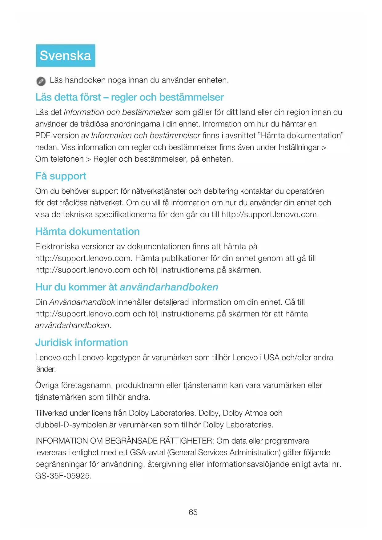 .Sådan tænder og slukker du Det kan være nødvendigt at oplade batteriet, før du bruger din enhed. Oplad batteriet som vist. Slut din enhed til en stikkontakt vha. det medfølgende kabel og USB-strømadapteren. Tænd: Tryk på og hold tænd/sluk-knappen nede, indtil Lenovo-logoet vises. Sluk: Tryk på og hold tænd/sluk-knappen nede i et par sekunder, og tryk derefter på Sluk. Genstart: Tryk på og hold tænd/sluk-knappen nede i ca 12 sekunder. Begynd at bruge din enhed Sådan tager du skærmbilleder Tryk på og hold tænd/sluk-knappen og lydstyrke ned-knappen nede på samme tid. 64Läs detta först – regler och bestämmelser Läs det Information och bestämmelser som gäller för ditt land eller din region innan du använder de trådlösa anordningarna i din enhet. Information om hur du hämtar en PDF-version av Information och bestämmelser finns i avsnittet ”Hämta dokumentation” nedan. Viss information om regler och bestämmelser finns även under Inställningar > Om telefonen > Regler och bestämmelser, på enheten. Få support Om du behöver support för nätverkstjänster och debitering kontaktar du operatören för det trådlösa nätverket. Om du vill få information om hur du använder din enhet och visa de tekniska specifikationerna för den går du till http://support.lenovo.com. Hämta dokumentation Elektroniska versioner av dokumentationen finns att hämta på http://support.lenovo.com. Hämta publikationer för din enhet genom att gå till http://support.lenovo.com och följ instruktionerna på skärmen. Hur du kommer åt användarhandboken Din Användarhandbok innehåller detaljerad information om din enhet. Gå till http://support.lenovo.com och följ instruktionerna på skärmen för att hämta användarhandboken. Juridisk information Lenovo och Lenovo-logotypen är varumärken som tillhör Lenovo i USA och/eller andra länder. Övriga företagsnamn, produktnamn eller tjänstenamn kan vara varumärken eller tjänstemärken som tillhör andra. Tillverkad under licens från Dolby Laboratories. Dolby, Dolby Atmos och dubbel-D-symbolen är varumärken som tillhör Dolby Laboratories. INFORMATION OM BEGRÄNSADE RÄTTIGHETER: Om data eller programvara levereras i enlighet med ett GSA-avtal (General Services Administration) gäller följande begränsningar för användning, återgivning eller informationsavslöjande enligt avtal nr. GS-35F-05925. Läs handboken noga innan du använder enheten.