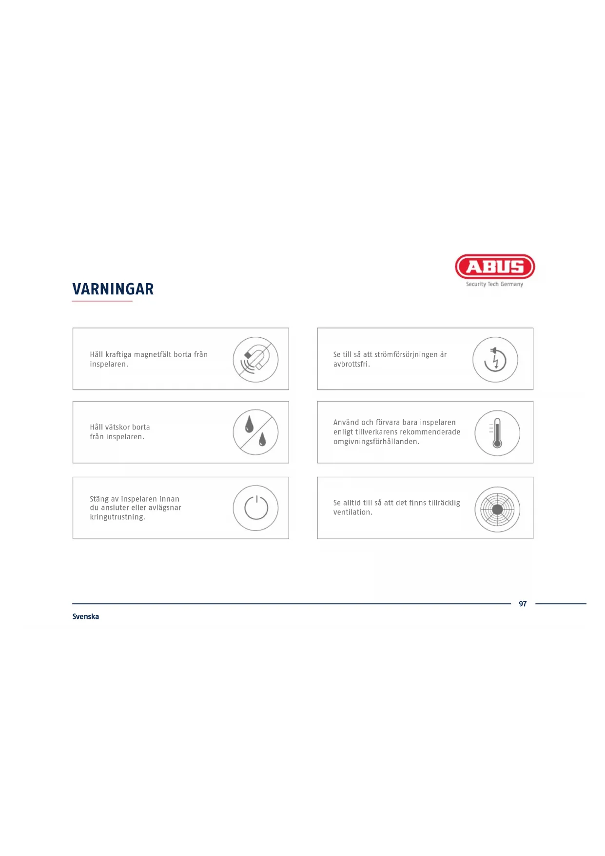 - Snabbguide Snabbguide97 Svenska VARNINGAR Använd och förvara bara inspelaren enligt tillverkarens rekommenderade omgivningsförhållanden. Se alltid till så att det nns tillräcklig ventilation. Se till så att strömförsörjningen är avbrottsfri