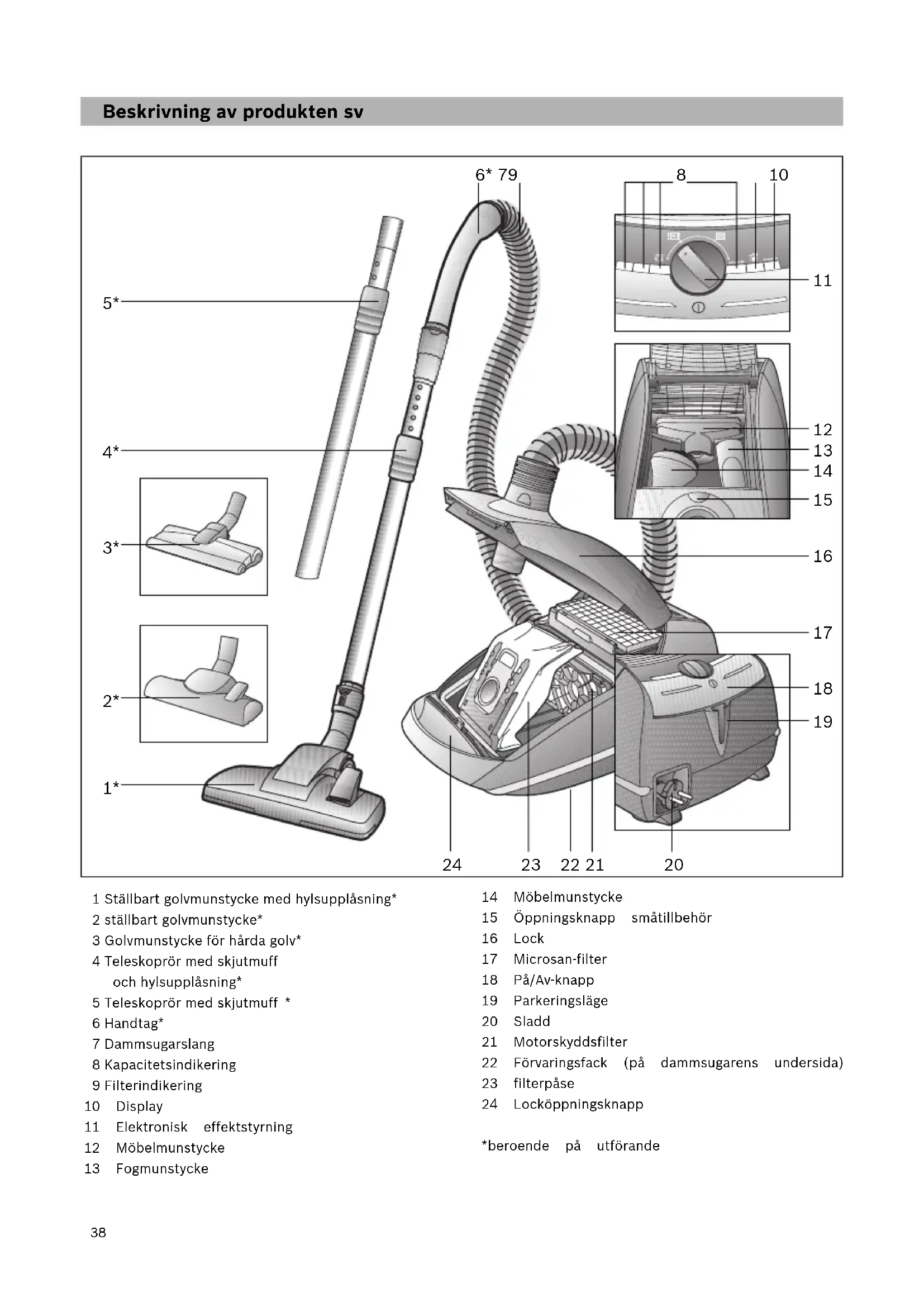 6 Handtag* 7 Dammsugarslang 8 Kapacitetsindikering 9 Filterindikering 10 Display 11 Elektronisk effektstyrning 12 Möbelmunstycke 13 Fogmunstycke 14 Möbelmunstycke 15 Öppningsknapp småtillbehör 16 Lock 17 Microsan-filter 18 På/Av-knapp 19 Parkeringsläge 20 Sladd 21 Motorskyddsfilter 22 Förvaringsfack (på dammsugarens undersida) 23 filterpåse 24 Locköppningsknapp *beroende på utförande 6* 79