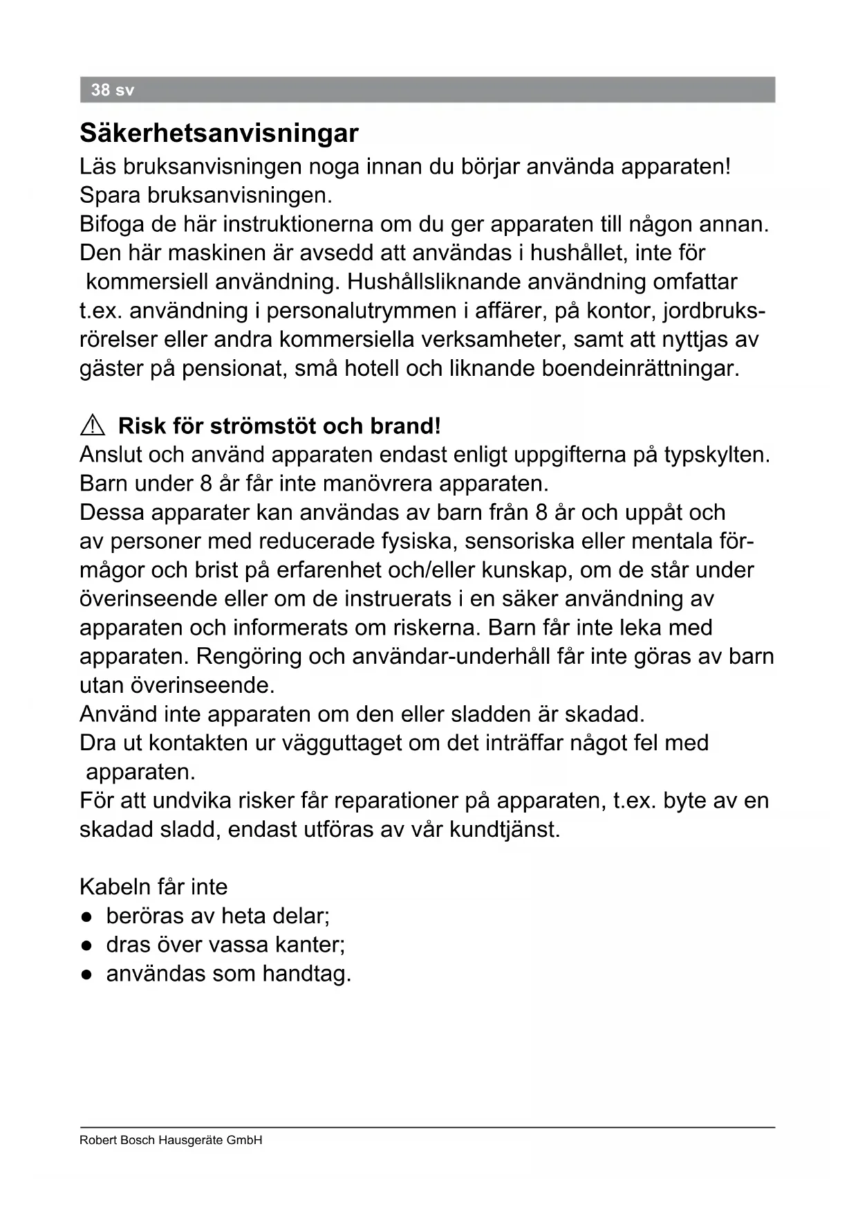 Garanti For dette apparatet gjelder de garantibetin- gelser som er oppgitt av vår representant i de respektive land. Detaljer om disse garan- tibetingelsene får du ved å henvende deg til elektrohandelen der du har kjøpt apparatet. Ved krav i forbindelse med garantiytelser, er det i alle fall nødvendig å legge fram kvitte- ring for kjøpet av apparatet. Det tas forbehold om endringer. Tekniske data Elektrisk tilkopling (spenning / frekvens) 220 – 240 V 50 / 60 Hz Varmeeffekt 31 W38 Robert Bosch Hausgeräte GmbH 38 sv Säkerhetsanvisningar Läs bruksanvisningen noga innan du börjar använda apparaten! Spara bruksanvisningen. Bifoga de här instruktionerna om du ger apparaten till någon annan. Den här maskinen är avsedd att användas i hushållet, inte för kommersiell användning. Hushållsliknande användning omfattar t.ex. användning i personalutrymmen i affärer, på kontor, jordbruks- rörelser eller andra kommersiella verksamheter, samt att nyttjas av gäster på pensionat, små hotell och liknande boendeinrättningar.