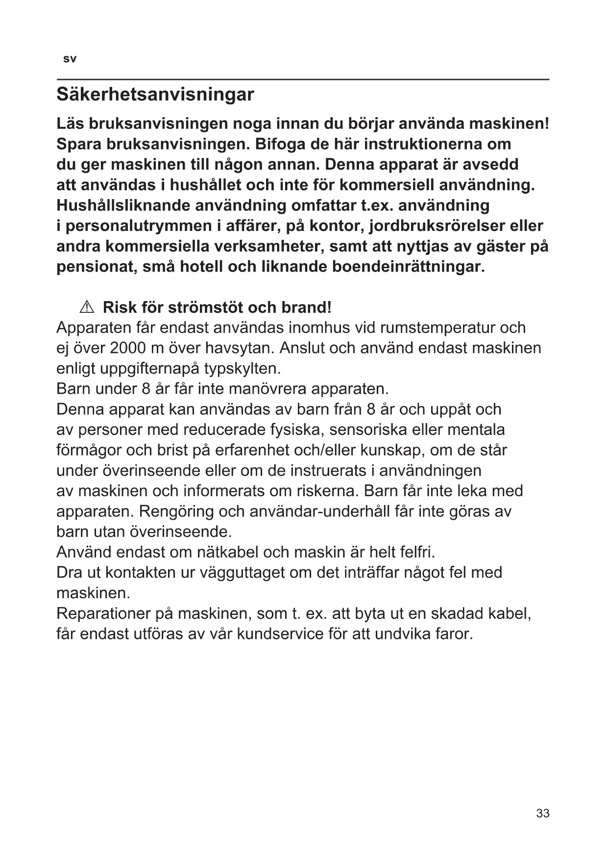 Säkerhetsanvisningar Läs bruksanvisningen noga innan du börjar använda maskinen! Spara bruksanvisningen. Bifoga de här instruktionerna om du ger maskinen till någon annan. Denna apparat är avsedd att användas i hushållet och inte för kommersiell användning. Hushållsliknande användning omfattar t.ex. användning i personalutrymmen i affärer, på kontor, jordbruksrörelser eller andra kommersiella verksamheter, samt att nyttjas av gäster på pensionat, små hotell och liknande boendeinrättningar. A Risk för strömstöt och brand! Apparaten får endast användas inomhus vid rumstemperatur och ej över 2000 m över havsytan. Anslut och använd endast maskinen enligt uppgifternapå typskylten. Barn under 8 år får inte manövrera apparaten. Denna apparat kan användas av barn från 8 år och uppåt och av personer med reducerade fysiska, sensoriska eller mentala förmågor och brist på erfarenhet och/eller kunskap, om de står under överinseende eller om de instruerats i användningen av maskinen och informerats om riskerna. Barn får inte leka med apparaten. Rengöring och användar-underhåll får inte göras av barn utan överinseende. Använd endast om nätkabel och maskin är helt felfri. Dra ut kontakten ur vägguttaget om det inträffar något fel med maskinen. Reparationer på maskinen, som t. ex. att byta ut en skadad kabel, får endast utföras av vår kundservice för att undvika faror.34