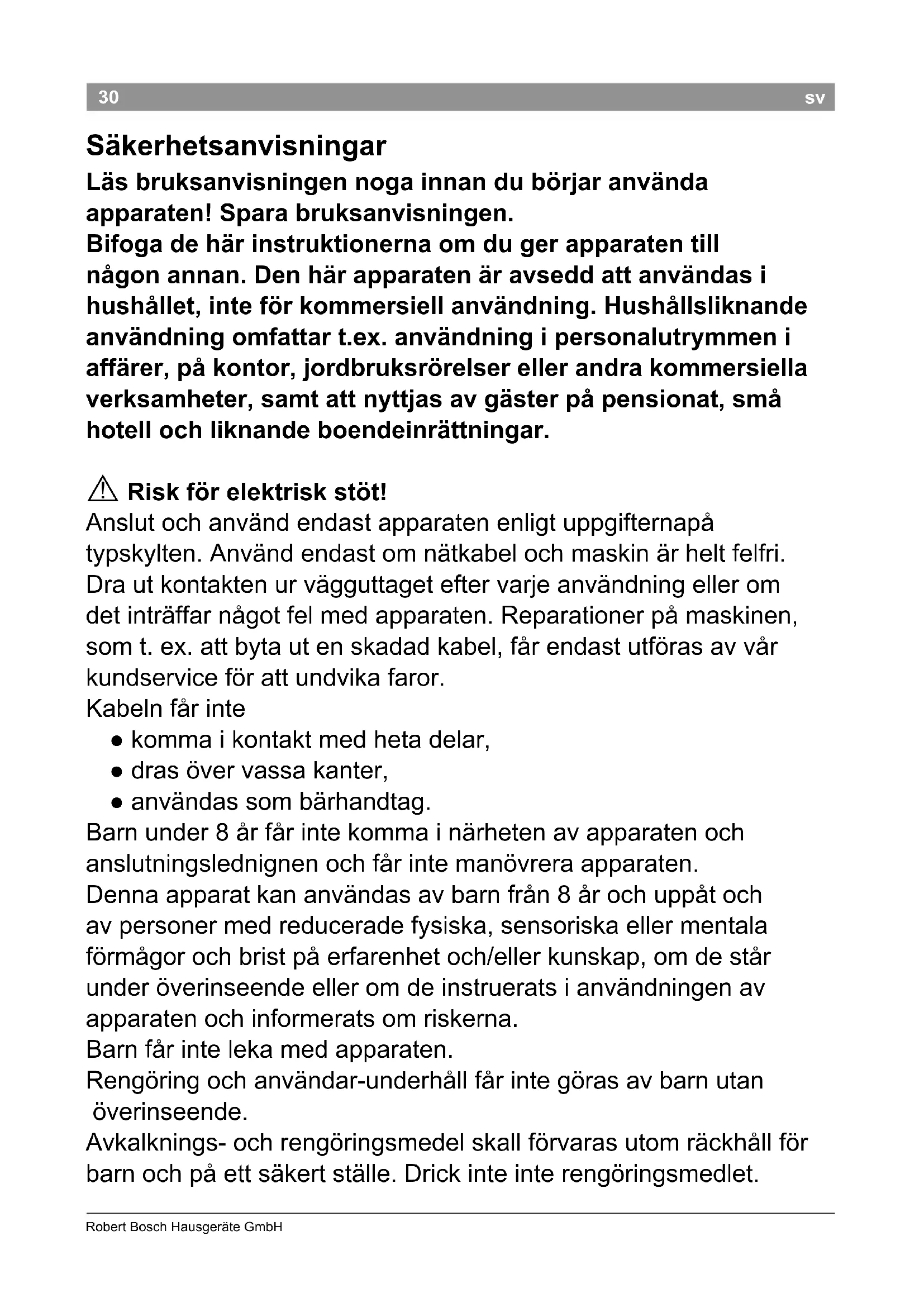 Risk för elektrisk stöt! Anslut och använd endast apparaten enligt uppgifternapå typskylten. Använd endast om nätkabel och maskin är helt felfri. Dra ut kontakten ur vägguttaget efter varje användning eller om det inträffar något fel med apparaten. Reparationer på maskinen, som t. ex. att byta ut en skadad kabel, får endast utföras av vår kundservice för att undvika faror. Kabeln får inte ● komma i kontakt med heta delar, ● dras över vassa kanter, ● användas som bärhandtag. Barn under 8 år får inte komma i närheten av apparaten och anslutningslednignen och får inte manövrera apparaten. Denna apparat kan användas av barn från 8 år och uppåt och av personer med reducerade fysiska, sensoriska eller mentala förmågor och brist på erfarenhet och/eller kunskap, om de står under överinseende eller om de instruerats i användningen av apparaten och informerats om riskerna. Barn får inte leka med apparaten. Rengöring och användar-underhåll får inte göras av barn utan överinseende. Avkalknings- och rengöringsmedel skall förvaras utom räckhåll för barn och på ett säkert ställe. Drick inte inte rengöringsmedlet.31 TAT 3A.. 06/2013