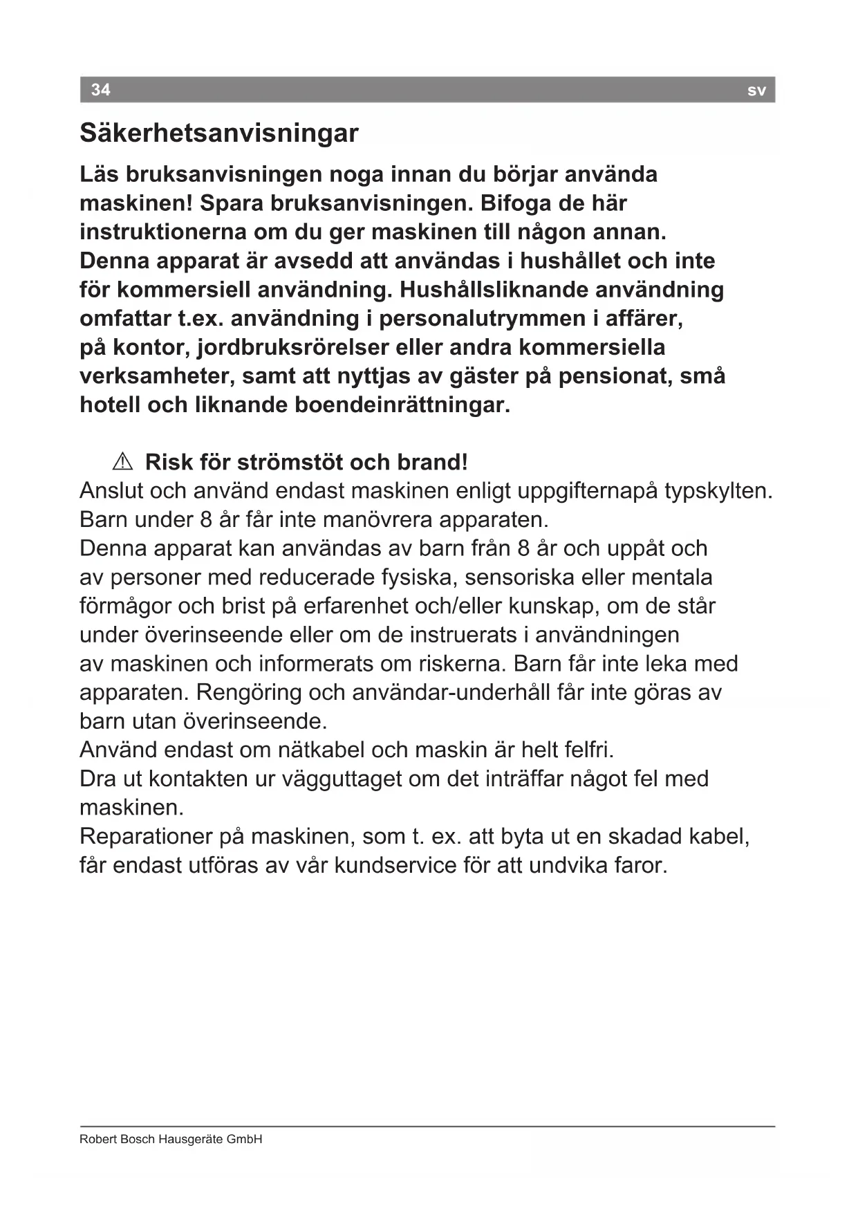Får inte användas i närheten av vatten som nns i badkar, tvättfat eller andra kärl. A Livsfara! Låt inte apparaten komma i kontakt med vatten. Detta är farligt även när apparaten är frånslagen. Dra därför alltid ut kontakten ur vägguttaget efter användning. Ytterligare skydd ger inbyggnad av en felströmsbrytare på upp till 30 mA i byggnadens installation. Rådgör med en elinstallatör. A Kvävningsrisk! Barn får inte leka med förpackningsmaterial. A Brännskaderisk! Styling- och volymmunstycket kan bli mycket varma. Låt dem svalna innan du tar loss dem.36 Robert Bosch Hausgeräte GmbH