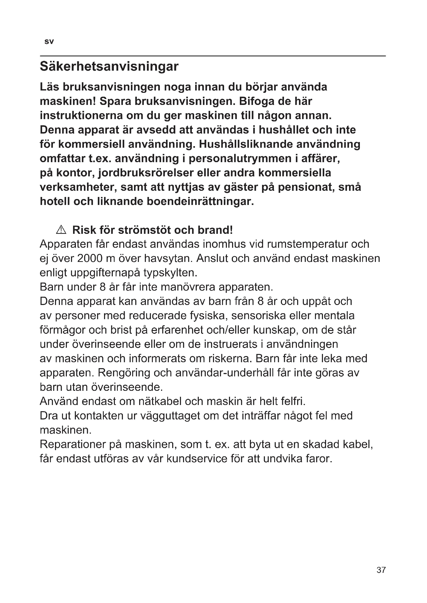 Säkerhetsanvisningar Läs bruksanvisningen noga innan du börjar använda maskinen! Spara bruksanvisningen. Bifoga de här instruktionerna om du ger maskinen till någon annan. Denna apparat är avsedd att användas i hushållet och inte för kommersiell användning. Hushållsliknande användning omfattar t.ex. användning i personalutrymmen i affärer, på kontor, jordbruksrörelser eller andra kommersiella verksamheter, samt att nyttjas av gäster på pensionat, små hotell och liknande boendeinrättningar. A Risk för strömstöt och brand! Apparaten får endast användas inomhus vid rumstemperatur och ej över 2000 m över havsytan. Anslut och använd endast maskinen enligt uppgifternapå typskylten. Barn under 8 år får inte manövrera apparaten. Denna apparat kan användas av barn från 8 år och uppåt och av personer med reducerade fysiska, sensoriska eller mentala förmågor och brist på erfarenhet och/eller kunskap, om de står under överinseende eller om de instruerats i användningen av maskinen och informerats om riskerna. Barn får inte leka med apparaten. Rengöring och användar-underhåll får inte göras av barn utan överinseende. Använd endast om nätkabel och maskin är helt felfri. Dra ut kontakten ur vägguttaget om det inträffar något fel med maskinen. Reparationer på maskinen, som t. ex. att byta ut en skadad kabel, får endast utföras av vår kundservice för att undvika faror.38