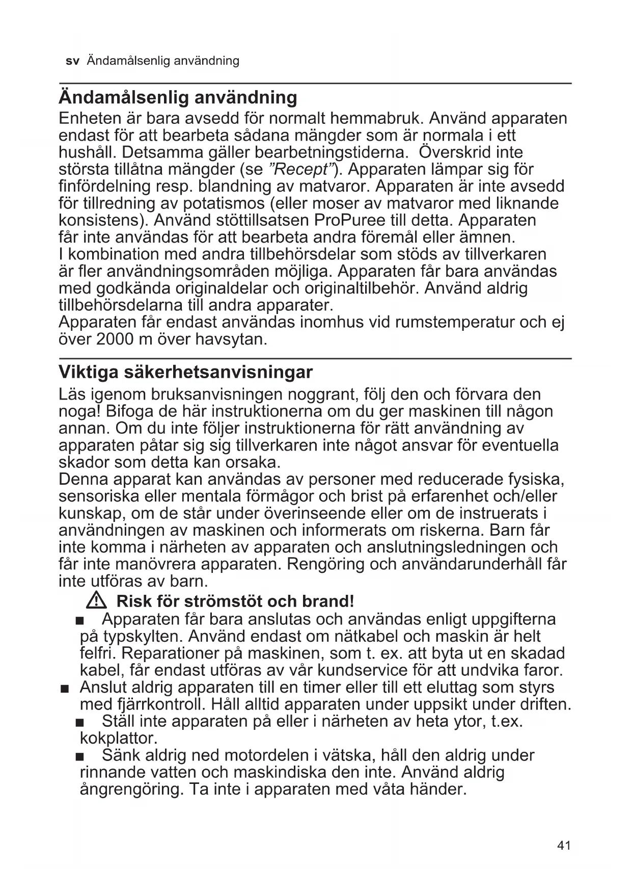 Vennligst kast innpakningsmaterialet på en miljø- og forskriftsmessig måte. Dette apparatet er klassifisert i henhold til det europeiske direk- tivet 2012/19/EU om avhending av elektrisk- og elektronisk utstyr (waste electrical and electronic equipment – WEEE). Direktivet angir rammene for innlevering og gjenvinning av innbytteprodukter. Faghandelen kan gi opplysninger om aktuelle avfallsmottak. Garanti For dette apparatet gjelder de garantibe- tingelser som er oppgitt av vår representant i de respektive land. Detaljer om disse garantibetingelsene får du ved å henvende deg til elektrohandelen der du har kjøpt apparatet. Ved krav i forbindelse med garantiytelser, er det i alle fall nødvendig å legge fram kvittering for kjøpet av apparatet. Det tas forbehold om endringer.41 sv Ändamålsenlig användning Ändamålsenlig användning Enheten är bara avsedd för normalt hemmabruk. Använd apparaten endast för att bearbeta sådana mängder som är normala i ett hushåll. Detsamma gäller bearbetningstiderna. Överskrid inte största tillåtna mängder (se ”Recept”). Apparaten lämpar sig för finfördelning resp. blandning av matvaror. Apparaten är inte avsedd för tillredning av potatismos (eller moser av matvaror med liknande konsistens). Använd stöttillsatsen ProPuree till detta. Apparaten får inte användas för att bearbeta andra föremål eller ämnen. I kombination med andra tillbehörsdelar som stöds av tillverkaren är fler användningsområden möjliga. Apparaten får bara användas med godkända originaldelar och originaltilbehör. Använd aldrig tillbehörsdelarna till andra apparater. Apparaten får endast användas inomhus vid rumstemperatur och ej över 2000 m över havsytan. Viktiga säkerhetsanvisningar Läs igenom bruksanvisningen noggrant, följ den och förvara den noga! Bifoga de här instruktionerna om du ger maskinen till någon annan. Om du inte följer instruktionerna för rätt användning av apparaten påtar sig sig tillverkaren inte något ansvar för eventuella skador som detta kan orsaka. Denna apparat kan användas av personer med reducerade fysiska, sensoriska eller mentala förmågor och brist på erfarenhet och/eller kunskap, om de står under överinseende eller om de instruerats i användningen av maskinen och informerats om riskerna. Barn får inte komma i närheten av apparaten och anslutningsledningen och får inte manövrera apparaten. Rengöring och användarunderhåll får inte utföras av barn. W Risk för strömstöt och brand! Ŷ Apparaten får bara anslutas och användas enligt uppgifterna på typskylten. Använd endast om nätkabel och maskin är helt felfri. Reparationer på maskinen, som t. ex. att byta ut en skadad kabel, får endast utföras av vår kundservice för att undvika faror. Ŷ Anslut aldrig apparaten till en timer eller till ett eluttag som styrs med fjärrkontroll. Håll alltid apparaten under uppsikt under driften. Ŷ Ställ inte apparaten på eller i närheten av heta ytor, t.ex. kokplattor. Ŷ Sänk aldrig ned motordelen i vätska, håll den aldrig under rinnande vatten och maskindiska den inte. Använd aldrig ångrengöring. Ta inte i apparaten med våta händer.42 sv Viktiga säkerhetsanvisningar Ŷ Om apparaten skulle falla ned i vatten eller någon annan vätska får du inte fanvända den mera. Ŷ Sänk inte ned mixerfoten längre i mixgodset än till markeringen Í. Risk för elektrisk stöt! Ŷ Dra alltid ut nätkabeln ur uttaget efter varje användning, när du inte har apparaten under uppsikt, före hopsättning, isärtagning eller rengöring och om ett fel skulle uppkomma. W Risk för personskador! Ŷ Dra alltid ut nätkabeln ur uttaget efter varje användning, när du inte har apparaten under uppsikt, före hopsättning, isärtagning eller rengöring och om ett fel skulle uppkomma. Ŷ Efter avstängning fortsätter drivuttaget att rotera en kort stund. Vänta tills drivningen står helt stilla. Ŷ Rör aldrig mixerfotskniven. Rengör aldrig mixerfotskniven med bara händer. W Risk för brännskador Ŷ Var försiktig när du bearbetar varma matvaror! Varma matvaror kan stänka omkring vid bearbetningen. W Kvävningsrisk! Ŷ Barn får inte leka med förpackningsmaterial. W Observera! Ŷ Vi rekommenderar dig att inte låta apparaten vara igång längre tid än vad som behövs för att bearbeta matvarorna. Låt inte apparaten gå på tomgång. Ŷ Mixerbägaren är inte avsedd att användas i mikrovågsugn. Ŷ Ställ aldrig mixerfoten på varma ytor och använd den inte till mycket varma matvaror. Låt kokande matvaror svalna till 80°C eller lägre före bearbetningen. Om du ska använda stavmixern i en kastrull måste du först ta bort kastrullen från spisplattan. W Viktigt! Du måste rengöra apparaten noggrant efter varje användning och om den inte har använts under en längre tid.X ”Rengöring” se sidan 4443 sv Innehåll 8 Mixerbägare Om du använder mixerbägaren hindrar du blandningen från att stänka. 9 Lock Sätt på locket på mixerbägaren om du ska förvara de bearbetade matvarorna. Tillbehör * (separata bruksanvisningar) 10 Visp med drivaxel