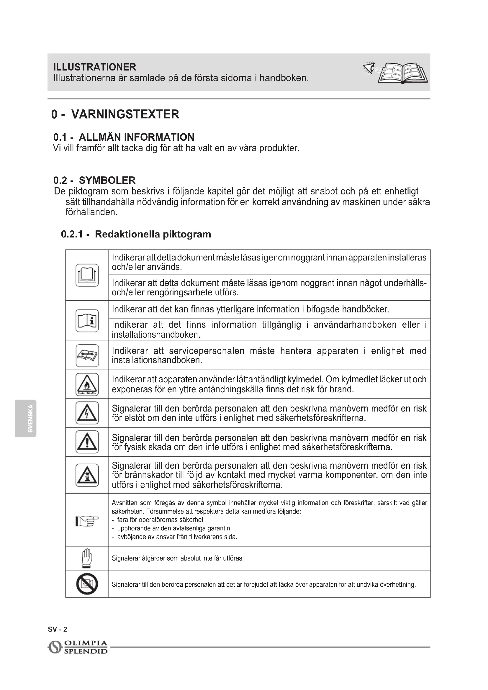 överföring till tredje part utan ett uttryckligt godkännande från företaget OLIMPIA SPLENDID. Maskinerna kan undergå uppdateringar och därmed ha andra detaljer än de som framställs, utan att det därför äventyrar betydelsen av texterna i denna handbok.