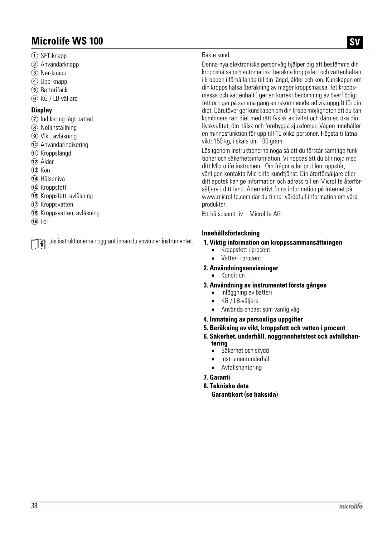 Genauigkeit und Reproduzierbarkeit im Toleranzbereich zwischen: +/- 0,1 kg/0,2 lb/1/4 st38 Display Bäste kund Denna nya elektroniska personvåg hjälper dig att bestämma din kroppshälsa och automatiskt beräkna kroppsfett och vattenhalten i kroppen i förhållande till din längd, ålder och kön. Kunskapen om din kropps hälsa (beräkning av mager kroppsmassa, fet kropps- massa och vattenhalt ) ger en korrekt bedömning av överflödigt fett och ger på samma gång en rekommenderad viktuppgift för din diet. Därutöver ger kunskapen om din kropp möjligheten att du kan kombinera rätt diet med rätt fysisk aktivitet och därmed öka din livskvalitet, din hälsa och förebygga sjukdomar. Vågen innehåller en minnesfunktion för upp till 10 olika personer. Högsta tillåtna vikt: 150 kg, i skala om 100 gram. Läs igenom instruktionerna noga så att du förstår samtliga funk- tioner och säkerhetsinformation. Vi hoppas att du blir nöjd med ditt Microlife instrument. Om frågor eller problem uppstår, vänligen kontakta Microlife-kundtjänst. Din återförsäljare eller ditt apotek kan ge information och adress till en Microlife återför- säljare i ditt land. Alternativt finns information på Internet på www.microlife.com där du finner värdefull information om våra produkter. Ett hälsosamt liv – Microlife AG! Innehållsförteckning