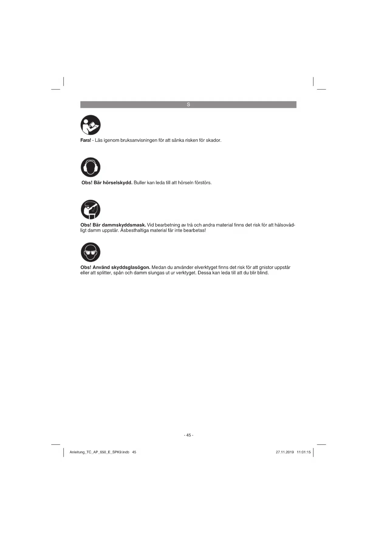Fara! - Läs igenom bruksanvisningen för att sänka risken för skador. Obs! Bär hörselskydd. Buller kan leda till att hörseln förstörs. Obs! Använd skyddsglasögon. Medan du använder elverktyget fi nns det risk för att gnistor uppstår eller att splitter, spån och damm slungas ut ur verktyget. Dessa kan leda till att du blir blind. Obs! Bär dammskyddsmask. Vid bearbetning av trä och andra material fi nns det risk för att hälsovåd- ligt damm uppstår. Asbesthaltiga material får inte bearbetas! Anleitung_TC_AP_650_E_SPK9.indb 45Anleitung_TC_AP_650_E_SPK9.indb 45 27.11.2019 11:01:1527.11.2019 11:01:15S