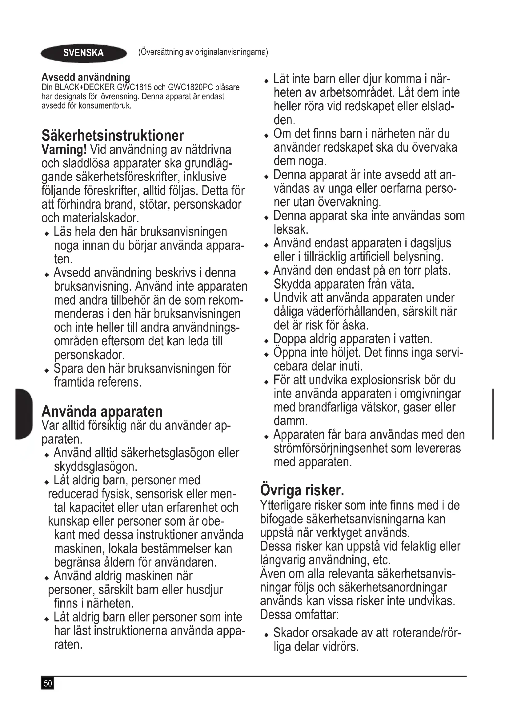 dB(A) Estes produtos estão também em conformidade com as Di- rectivas 2014/108/CE (até 19/04/2016), 2014/30/UE (a partir de 20/04/2016) e 2011/65/UE. Para mais informações, contacte a Black & Decker no endere- ço indicado em seguida ou consulte o verso do manual. O signatário é responsável pela compilação do cheiro técni- co e efectua esta declaração em nome da Black & Decker. R. Laverick Director de Engenharia Black & Decker Europe, 210 Bath Road, Slough, Berkshire, SL1 3YD Reino Unido 10/11/2015 Garantia A Black & Decker cona na qualidade dos seus produtos e oferece aos clientes uma garantia de 24 meses a partir da data de compra. Esta garantia é um complemento dos seus direitos estabelecidos por lei, não os prejudicando de forma alguma. A garantia é válida nos Estados-membros da União Europeia e nos países-membros da Zona Europeia de Co- mércio Livre. Para accionar a garantia, esta deve estar em conformidade com os termos e condições da Black&Decker e terá de apre- sentar comprovativos de compra ao vendedor ou a um agente de reparação autorizado. Os termos e condições da garantia de 2 anos da Black&Decker e a localização do agente de reparação autorizado mais próximo pode ser obtido na Inter- net em www.2helpU.com ou contactando uma lial da Black & Decker, cuja morada está indicada neste manual. Visite o nosso Website www.blackanddecker.co.uk para regis- tar o novo produto Black & Decker e manter-se actualizado relativamente a novos produtos e ofertas especiais.50 (Översättning av originalanvisningarna) SVENSKA Avsedd användning Din BLACK+DECKER GWC1815 och GWC1820PC blåsare har designats för lövrensning. Denna apparat är endast avsedd för konsumentbruk. Säkerhetsinstruktioner Varning! Vid användning av nätdrivna och sladdlösa apparater ska grundläg- gande säkerhetsföreskrifter, inklusive följande föreskrifter, alltid följas. Detta för att förhindra brand, stötar, personskador och materialskador. u Läs hela den här bruksanvisningen noga innan du börjar använda appara- ten. u Avsedd användning beskrivs i denna bruksanvisning. Använd inte apparaten med andra tillbehör än de som rekom- menderas i den här bruksanvisningen och inte heller till andra användnings- områden eftersom det kan leda till personskador. u Spara den här bruksanvisningen för framtida referens. Använda apparaten Var alltid försiktig när du använder ap- paraten. u Använd alltid säkerhetsglasögon eller skyddsglasögon. u Låt aldrig barn, personer med reducerad fysisk, sensorisk eller men- tal kapacitet eller utan erfarenhet och kunskap eller personer som är obe- kant med dessa instruktioner använda maskinen, lokala bestämmelser kan begränsa åldern för användaren. u Använd aldrig maskinen när personer, särskilt barn eller husdjur nns i närheten. u Låt aldrig barn eller personer som inte har läst instruktionerna använda appa- raten. u Låt inte barn eller djur komma i när- heten av arbetsområdet. Låt dem inte heller röra vid redskapet eller elslad- den. u Om det nns barn i närheten när du använder redskapet ska du övervaka dem noga. u Denna apparat är inte avsedd att an- vändas av unga eller oerfarna perso- ner utan övervakning. u Denna apparat ska inte användas som leksak. u Använd endast apparaten i dagsljus eller i tillräcklig articiell belysning. u Använd den endast på en torr plats. Skydda apparaten från väta. u Undvik att använda apparaten under dåliga väderförhållanden, särskilt när det är risk för åska. u Doppa aldrig apparaten i vatten. u Öppna inte höljet. Det nns inga servi- cebara delar inuti. u För att undvika explosionsrisk bör du inte använda apparaten i omgivningar med brandfarliga vätskor, gaser eller damm. u Apparaten får bara användas med den strömförsörjningsenhet som levereras med apparaten. Övriga risker. Ytterligare risker som inte nns med i de bifogade säkerhetsanvisningarna kan uppstå när verktyget används. Dessa risker kan uppstå vid felaktig eller långvarig användning, etc. Även om alla relevanta säkerhetsanvis- ningar följs och säkerhetsanordningar används kan vissa risker inte undvikas. Dessa omfattar: u Skador orsakade av att roterande/rör- liga delar vidrörs.51 (Översättning av originalanvisningarna) SVENSKA u Skador som uppstår vid byte av delar, blad eller tillbehör. u Skador som orsakas av långvarig användning av ett verktyg. Se till att re- gelbundet ta vilopauser när du använ- der ett verktyg under en längre period. u Hörselnedsättning.u Hälsorisker orsakade av inandning av damm när redskapet används (exem- pel: arbete med trä, särskilt ek, bok och MDF.) Efter användning u När den inte används bör apparaten förvaras utom räckhåll för barn på en torr plats med god ventilation. u Barn ska inte ha tillgång till apparater under förvaring. u När apparaten förvaras eller transpor- teras i en bil ska det placeras i baga- geutrymmet eller spännas fast så att det inte rör sig vid plötsliga ändringar av hastighet eller riktning. Kontroll och reparationer u Kontrollera att apparaten är hel och att inga delar är skadade innan du använ- der den. Kontrollera att inga delar är trasiga och att inget annat föreligger som kan påverka redskapets funktion. u Använd inte apparaten om någon del har skadats eller gått sönder. u Låt en auktoriserad verkstad reparera eller byta ut skadade eller trasiga de- lar. u Försök aldrig avlägsna eller byta ut andra delar än de som anges i den här bruksanvisningen. Vibrationer De deklarerade vibrationsemissionsvär- dena som anges i tekniska data och i deklarationen om uppfyllelse har uppmätts i enlighet med en standardtestmetod tillhandahållen av EN 50636 och kan användas för att jämföra ett verktyg med ett annat. Kan det dekla- rerade vibrationsemissionsvärdet också användas för preliminär utvärdering av exponering. Varning! Vibrationsemissionsvärdet under faktisk anv
