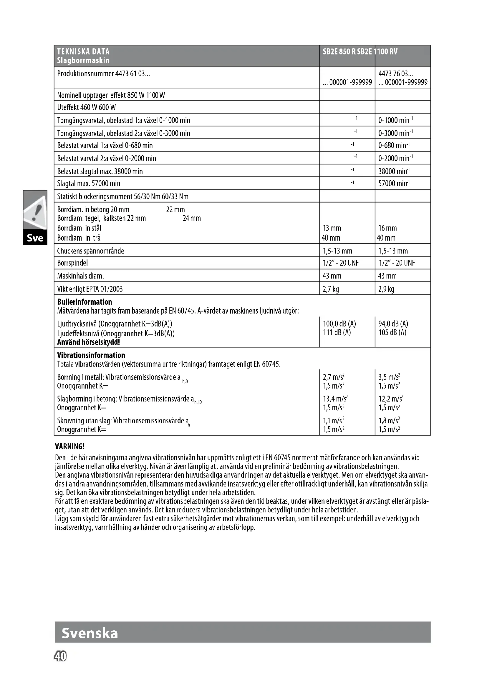 VARNING! Den i de här anvisningarna angivna vibrationsnivån har uppmätts enligt ett i EN 60745 normerat mätförfarande och kan användas vid jämförelse mellan olika elverktyg. Nivån är även lämplig att använda vid en preliminär bedömning av vibrationsbelastningen. Den angivna vibrationsnivån representerar den huvudsakliga användningen av det aktuella elverktyget. Men om elverktyget ska använ- das i andra användningsområden, tillsammans med avvikande insatsverktyg eller efter otillräckligt underhåll, kan vibrationsnivån skilja sig. Det kan öka vibrationsbelastningen betydligt under hela arbetstiden. För att få en exaktare bedömning av vibrationsbelastningen ska även den tid beaktas, under vilken elverktyget är avstängt eller är påsla- get, utan att det verkligen används. Det kan reducera vibrationsbelastningen betydligt under hela arbetstiden. Lägg som skydd för användaren fast extra säkerhetsåtgärder mot vibrationernas verkan, som till exempel: underhåll av elverktyg och insatsverktyg, varmhållning av händer och organisering av arbetsförlopp. Svenska41 English Sve VARNING! Läs alla säkerhetsanvisningar och andra tillhörande anvisningar. Fel som uppstår till följd av att anvisningarna nedan inte följts kan orsaka elstöt, brand och/eller allvarliga kroppsskador. Förvara alla varningar och anvisningar för framtida bruk.