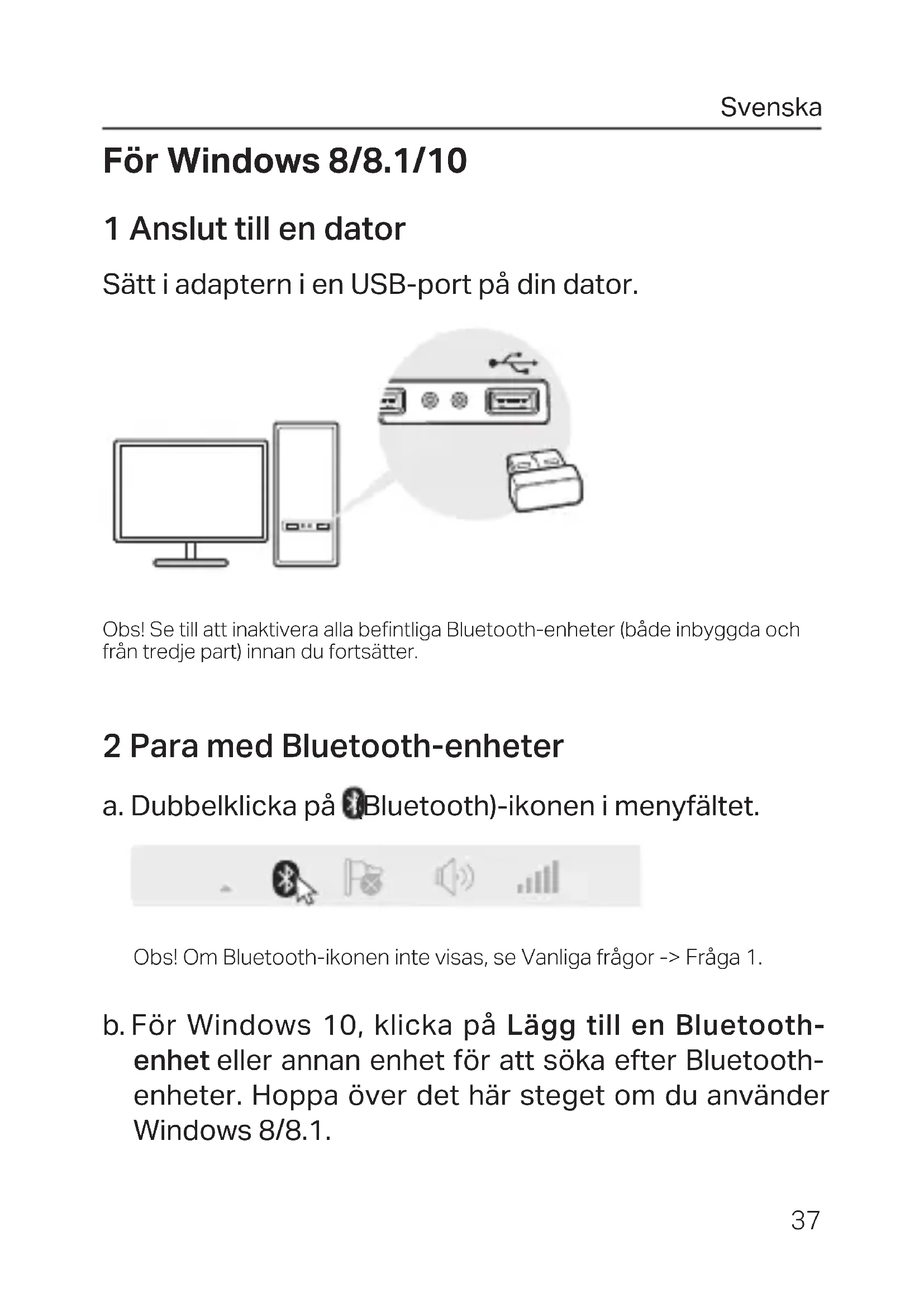För Windows 8/8.1/10 1 Anslut till en dator Sätt i adaptern i en USB-port på din dator. Obs! Se till att inaktivera alla bentliga Bluetooth-enheter (både inbyggda och från tredje part) innan du fortsätter. 2 Para med Bluetooth-enheter a. Dubbelklicka på (Bluetooth)-ikonen i menyfältet. Obs! Om Bluetooth-ikonen inte visas, se Vanliga frågor -> Fråga 1. b. För Windows 10, klicka på Lägg till en Bluetooth- enhet eller annan enhet för att söka efter Bluetooth- enheter. Hoppa över det här steget om du använder Windows 8/8.1.Svenska