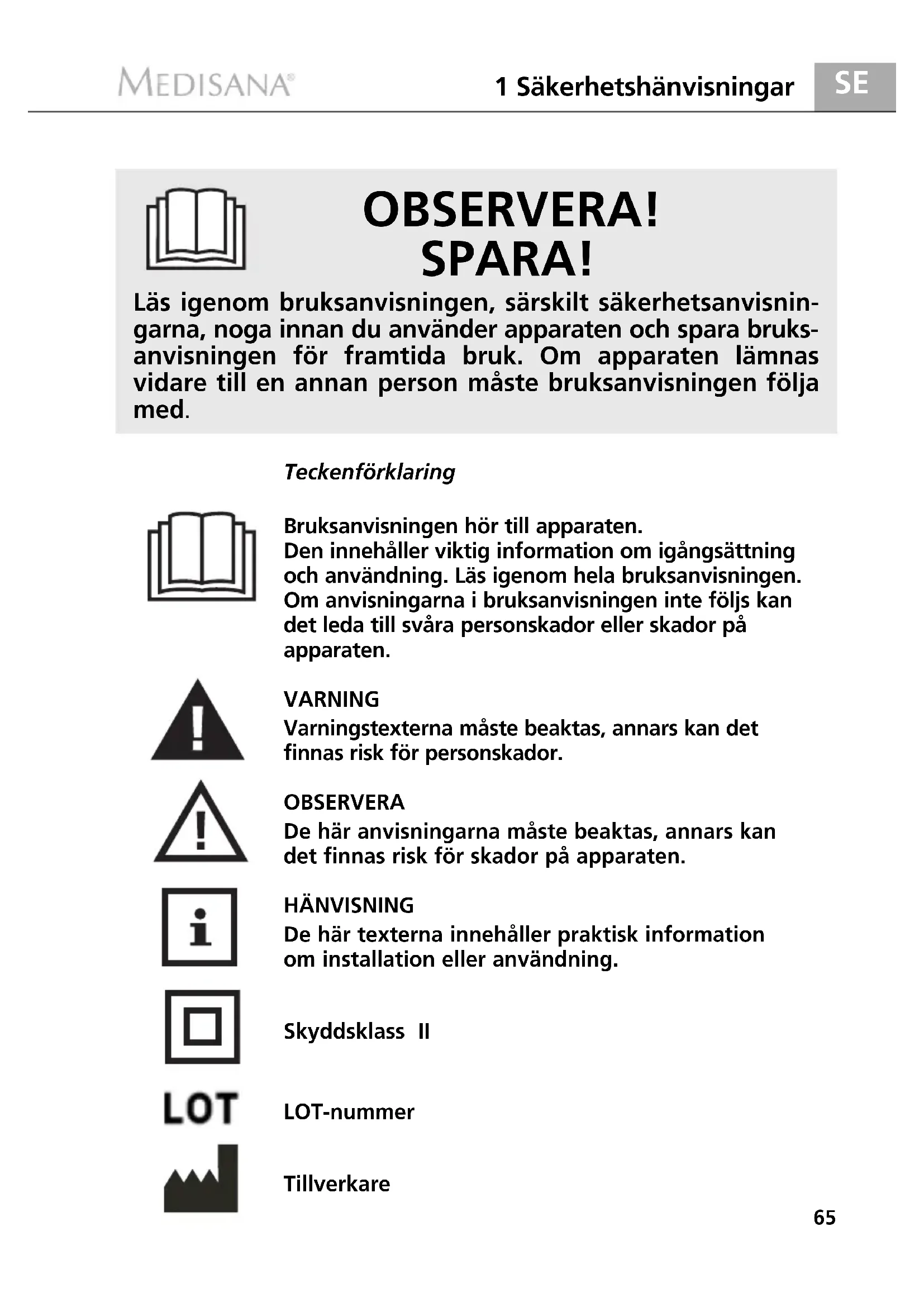 1 Säkerhetshänvisningar 65