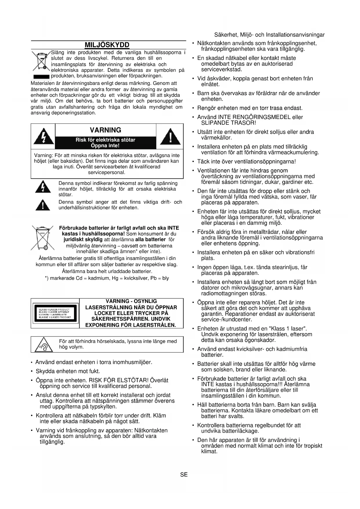 Sakerhet, Miljo- och Installationsanvisiningar