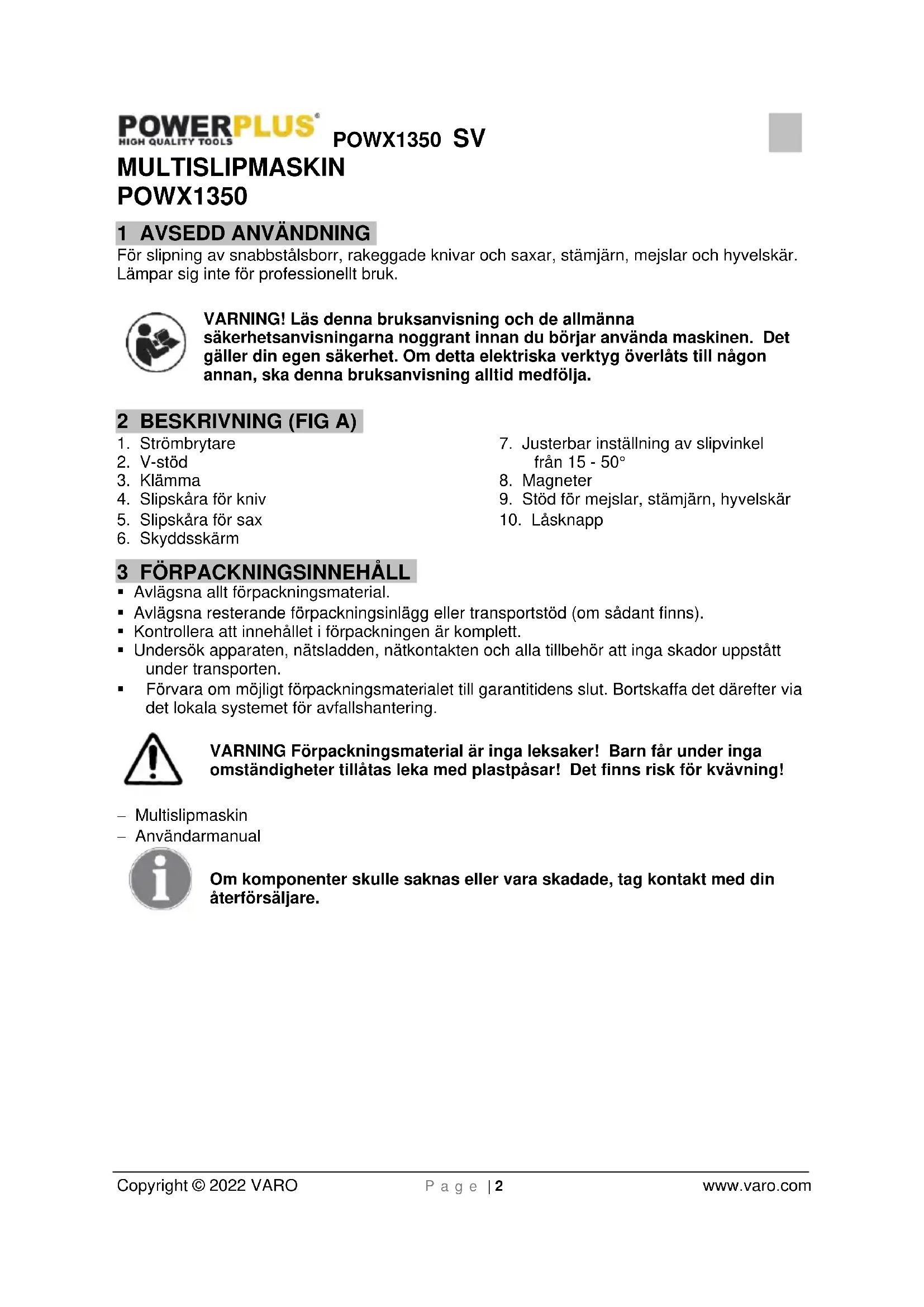 - Förvara om möjligt förpackningsmaterialet till garantitidens slut. Bortskaffa det därefter via det lokala systemet för avfallshantering. VARNING Förpackningsmaterial är inga leksaker! Barn får under inga omständigheter tillåtas leka med plastpåsar! Det finns risk för kvävning! − Multislipmaskin − Användarmanual Om komponenter skulle saknas eller vara skadade, tag kontakt med din återförsäljare.POWX1350 SV Copyright © 2022 VARO P a g e | 3 www.varo.com 4 SYMBOLER Följande symboler används i bruksanvisningen och/eller på maskinen: